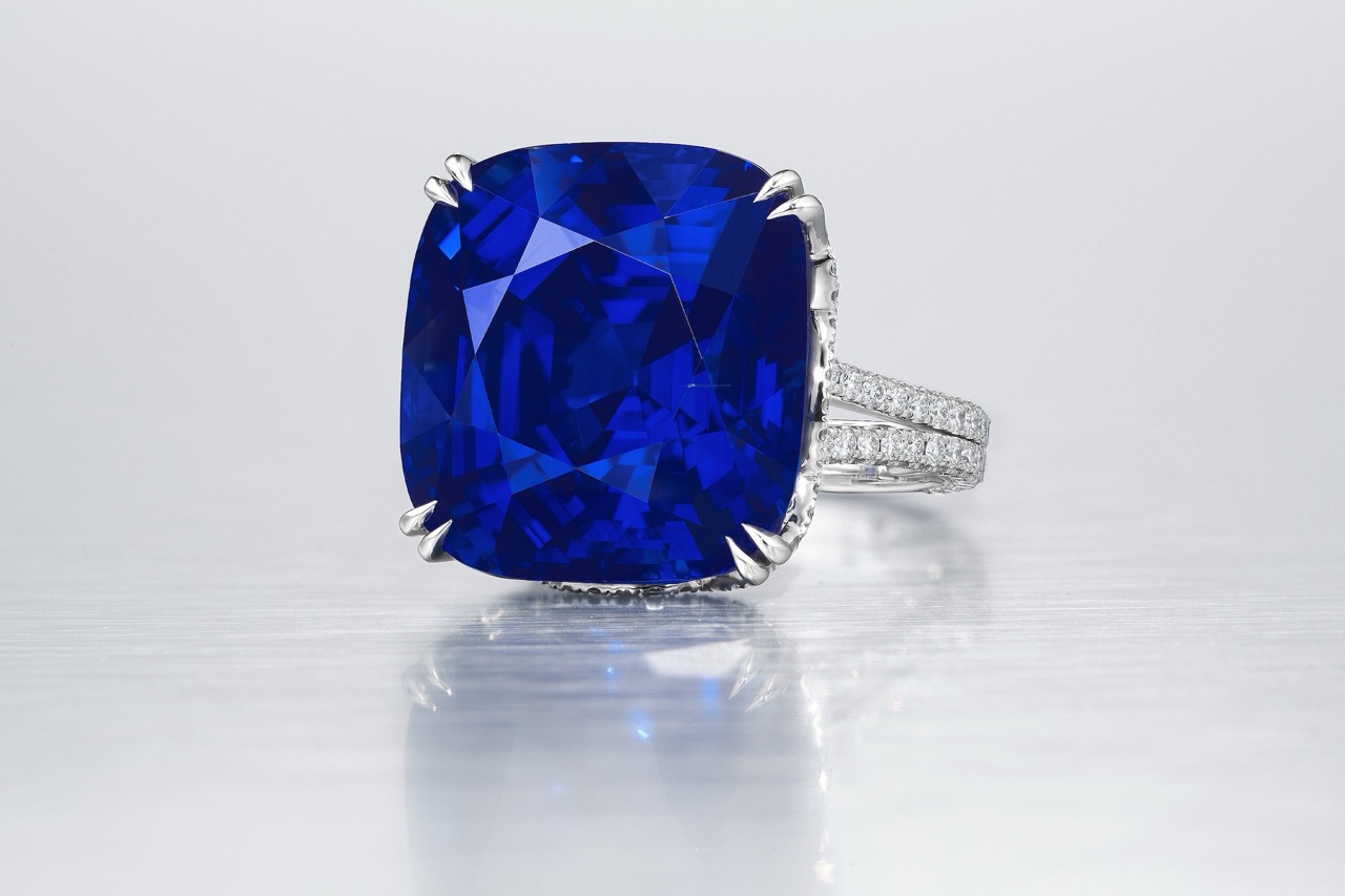 题图说明:“The Regent Kashmir”35.09克拉喀什米尔天然皇家蓝蓝宝石戒指拍卖现场