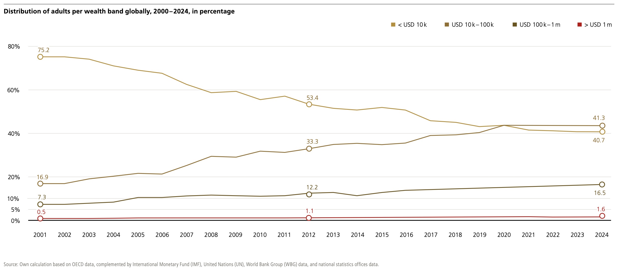 全球财富增长不仅体现在规模的扩张,也体现在结构的变化。报告指出,近十年来,1万美元以下的低财富区间人口占比持续下降,取而代之的是1万至10万美元之间的中产群体。