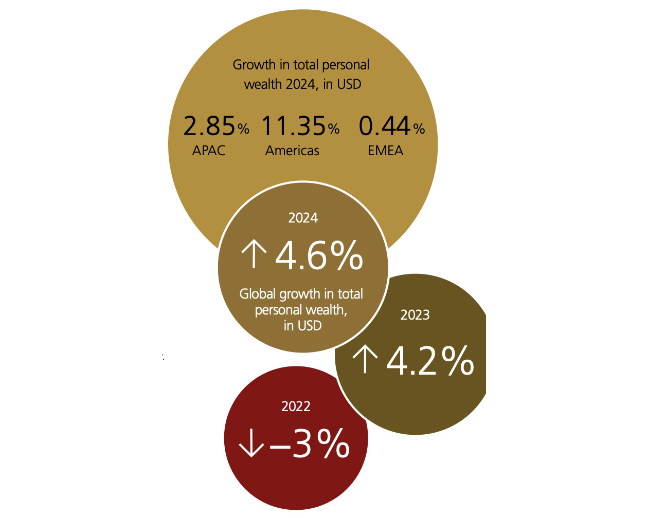 尽管全球财富总量创下新高,但增长却并不均衡。报告指出,2024年的财富增长主要集中在北美及美洲地区,增幅超过11%,这一增长得益于美元走强和金融市场活跃。相反,亚太地区(APAC)的增速不足3%,而欧洲、中东和非洲地区(EMEA)更低于0.5%,增长明显放缓。