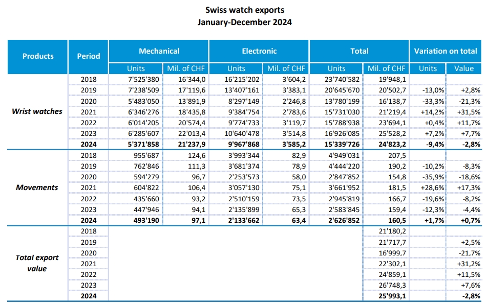 2018年至2024年瑞士钟表出口历年表现总览(截图)