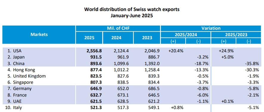 2025年1月至6月瑞士钟表出口前十市场表现(截图)