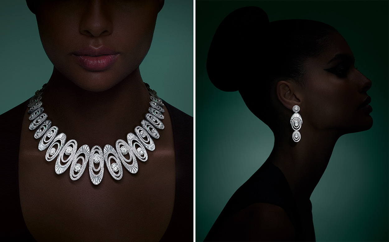 维多利娅从Milly-la-Forêt花园中繁茂的自然景致汲取灵感,结合工坊匠人的精湛技艺,打造出宛如蕾丝般繁复华丽的细腻质感,并融汇多种彩色宝石和珍贵材质,铺陈出一幅绚烂盛开的珠宝花园,尽显繁花似锦、各美其美的意境。