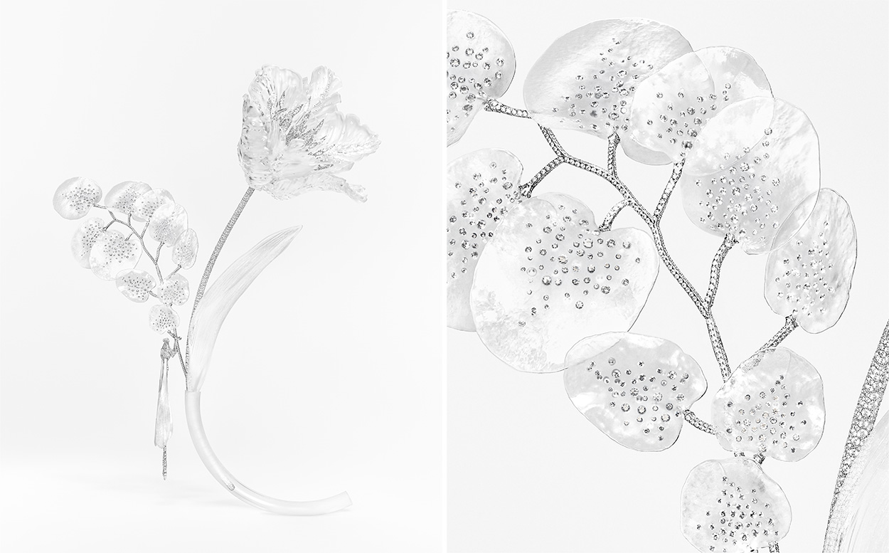 宝诗龙Carte Blanche, Impermanence高级珠宝系列,Composition N°6 郁金香,桉叶与蜻蜓