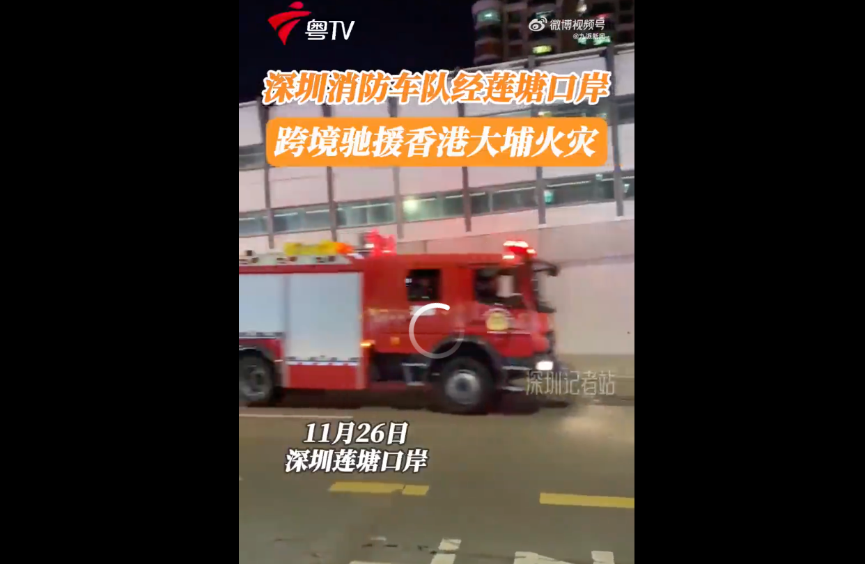 据粤TV报道,26日晚,已有深圳消防车队经莲塘口岸,跨境驰援香港大埔火灾。