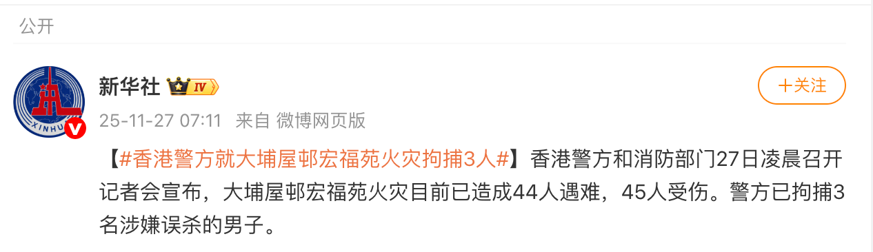 据新华社报道,香港警方和消防部门27日凌晨召开记者会宣布,大埔屋邨宏福苑火灾目前已造成44人遇难,45人受伤。警方已拘捕3名涉嫌误杀的男子。