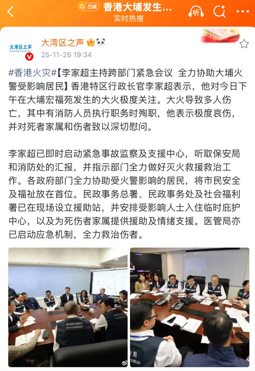 据@大湾区之声消息,香港特区行政长官李家超主持跨部门紧急会议,全力协助大埔火警受影响居民。李家超表示,他对26日下午在大埔宏福苑发生的大火极度关注。大火导致多人伤亡,其中有消防人员执行职务时殉职,他表示极度哀伤,并对死者家属和伤者致以深切慰问。