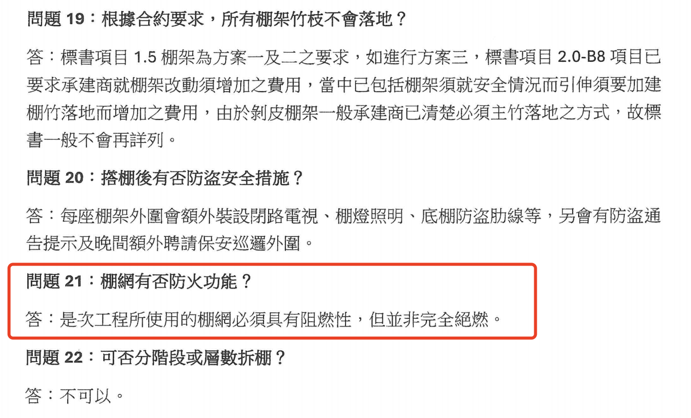 大维修期间,业主曾对棚架、保护网等问题向法团提出过疑问。蓝鲸新闻记者查阅法团网站公告梳理了相关信息:2024年7月15日、17日及19日,2024年8月2日及3日工程解说会时,有业主提问“棚网有否防火功能”,工程顾问公司和承办商答称“是次工程所使用的棚网必须具有阻燃性,但并非完全绝燃”。