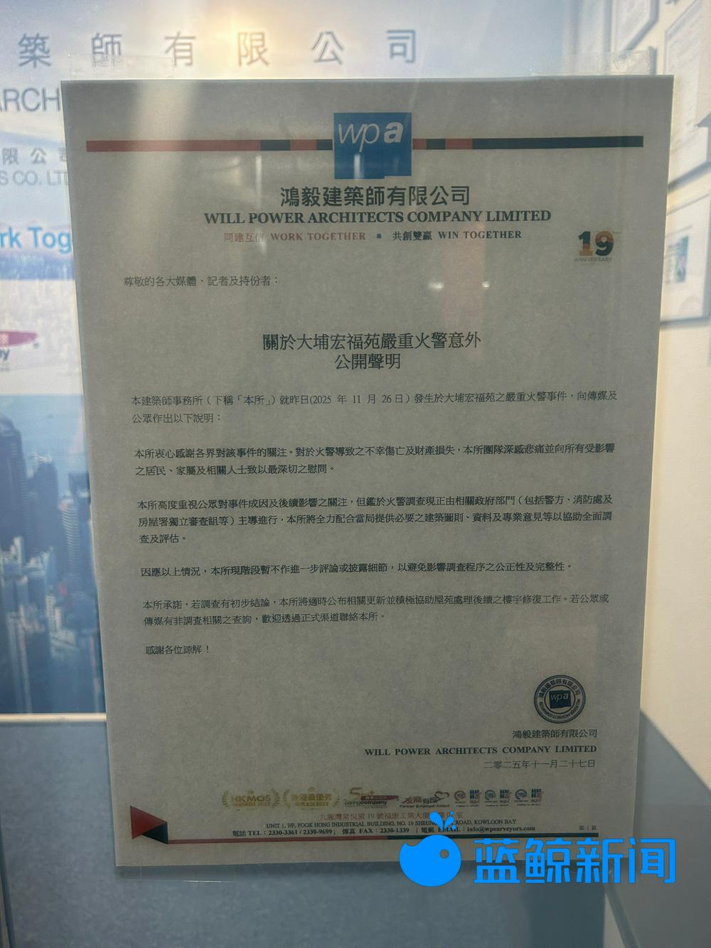 随后记者来到鸿毅建筑师有限公司,发现其在办公室门外张贴了公开声明,称该所高度重视公众对事件成因及后续影响的关注,但鉴于火警调查现正由相关政府部门主导进行,该所将全力配合当局提供必要之建筑图则、资料及专业意见等以协助全面调查及评估。“因应以上情况,本所现阶段暂不作进一步评论或披露细节,以避免影响调査程序之公正性及完整性。本所承诺,若调查有初步结论,本所将适时公布相关更新并积极协助屋苑处理后续之楼宇修复工作。”该声明显示。