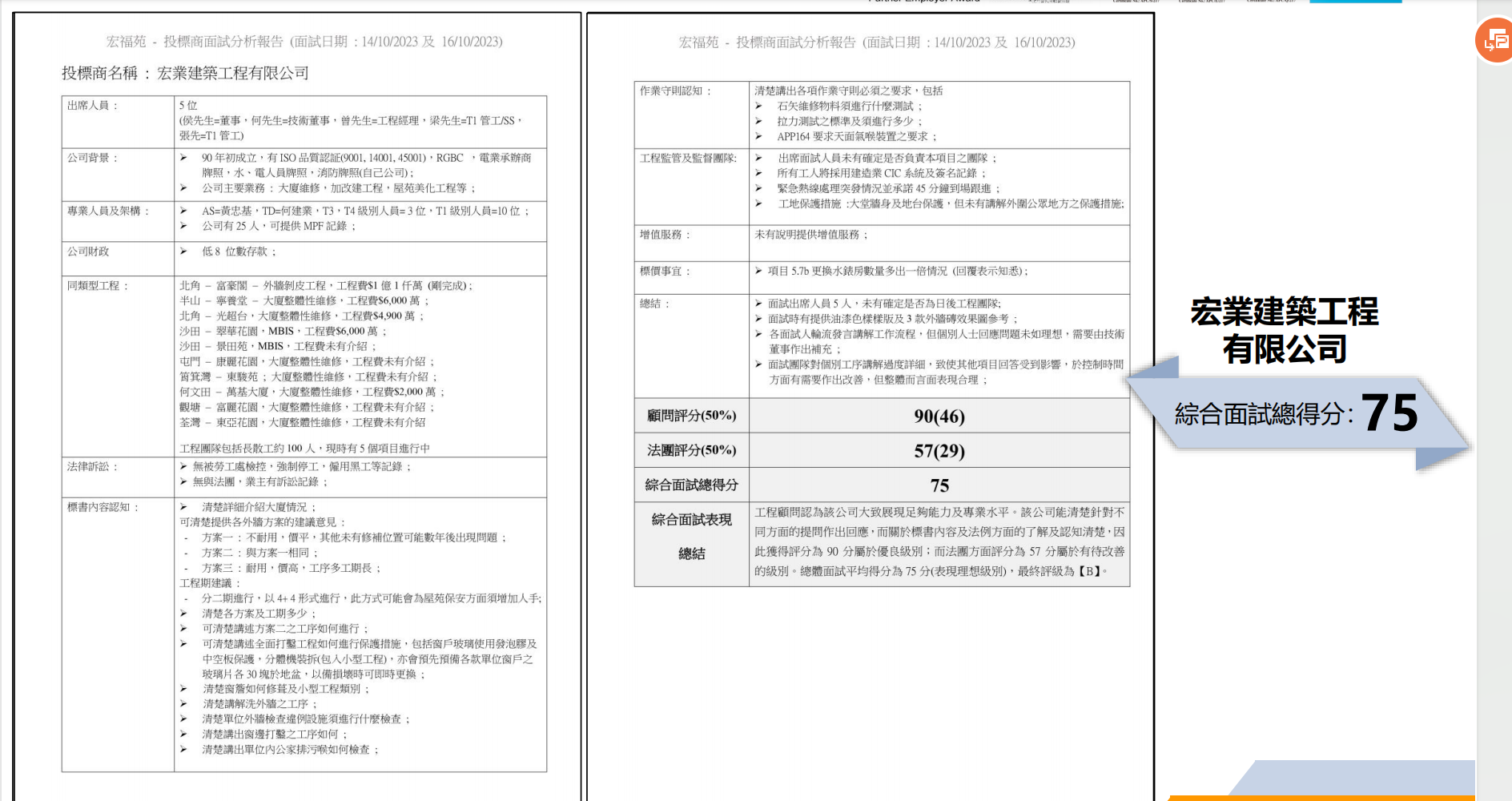 宏业建筑综合面试总得分为75分。(图源:《业主大会楼宇复修工程资料简报》)