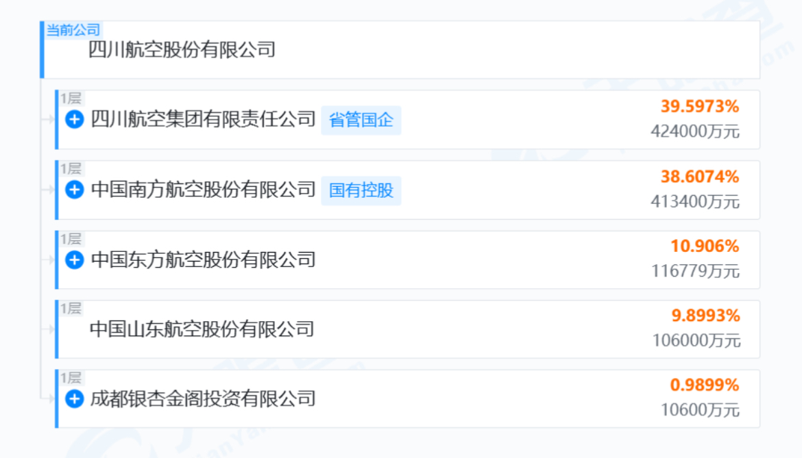 有业内人士指出,四川航空是中西部地区唯一机队规模超过100架的航空公司,并且是唯一有三大航参股的航空公司。从四川航空股权结构看,天眼查显示,川航集团持股39.5973%,为第一大股东。此外,南方航空持股38.6074为第二大股东,东方航空持股10.906%,为第三大股东。