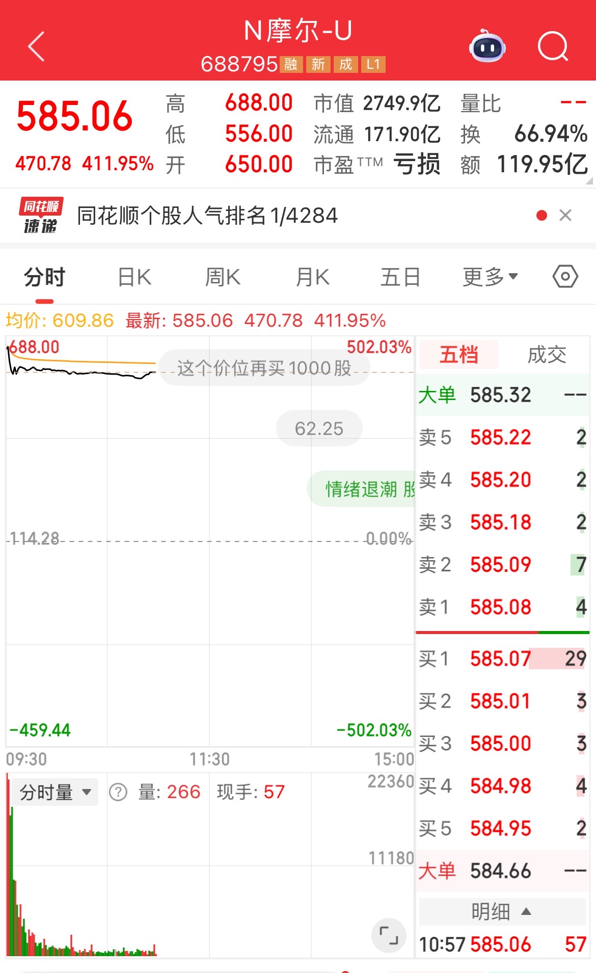 从上市首日的早盘表现来看,公司股价一度涨超500%,冲高至688元/股,截至记者发稿,摩尔线程的涨幅略有收窄,涨411.95%,报585.06元/股,但依旧保持高位态势,这也令一众中签的机构赚得“盆满钵满”。