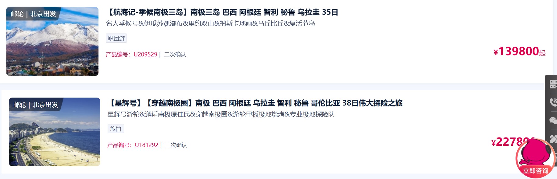 有业内人士表示:“众信旅游、拉美途等旅行社的极地游产品,同样售卖给B端旅行社、OTA平台,此外,国内众多旅行社也可以直接售卖极地邮轮公司的船票等产品,这也造就了众多平台售卖极地游产品的现状,不同产品权益有差别,需要游客仔细判断,选择适合自己的产品。”