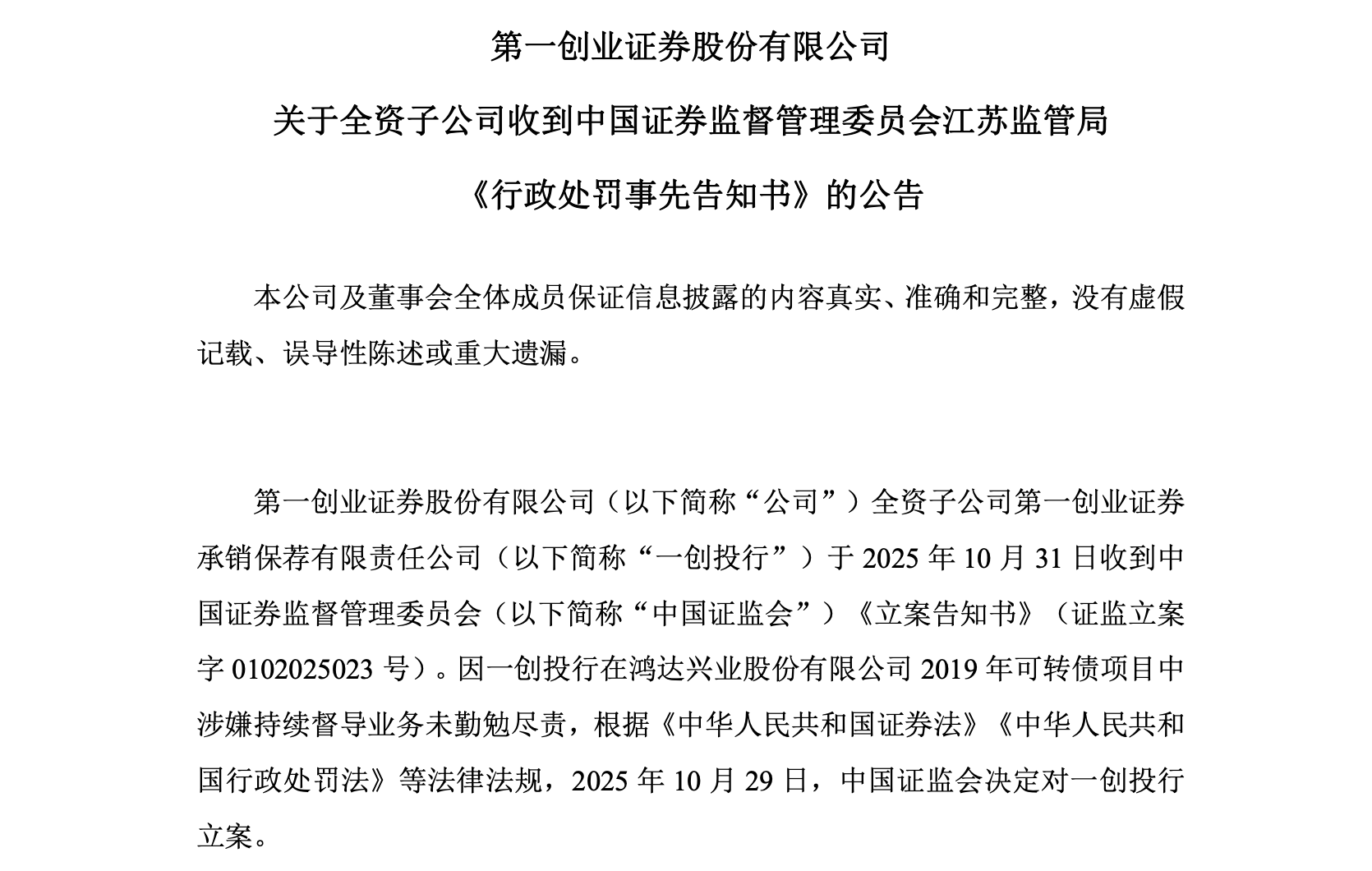 日前,第一创业证券(002797.SZ)公告,旗下投资银行业务子公司第一创业证券承销保荐有限责任公司(下称“一创投行”)收到江苏监管局的行政处罚决定书,因其在鸿达兴业2019年可转债项目的持续督导期间未勤勉尽责,被采取责令改正的监管措施,“没一罚三”合计罚款1698.11万元。