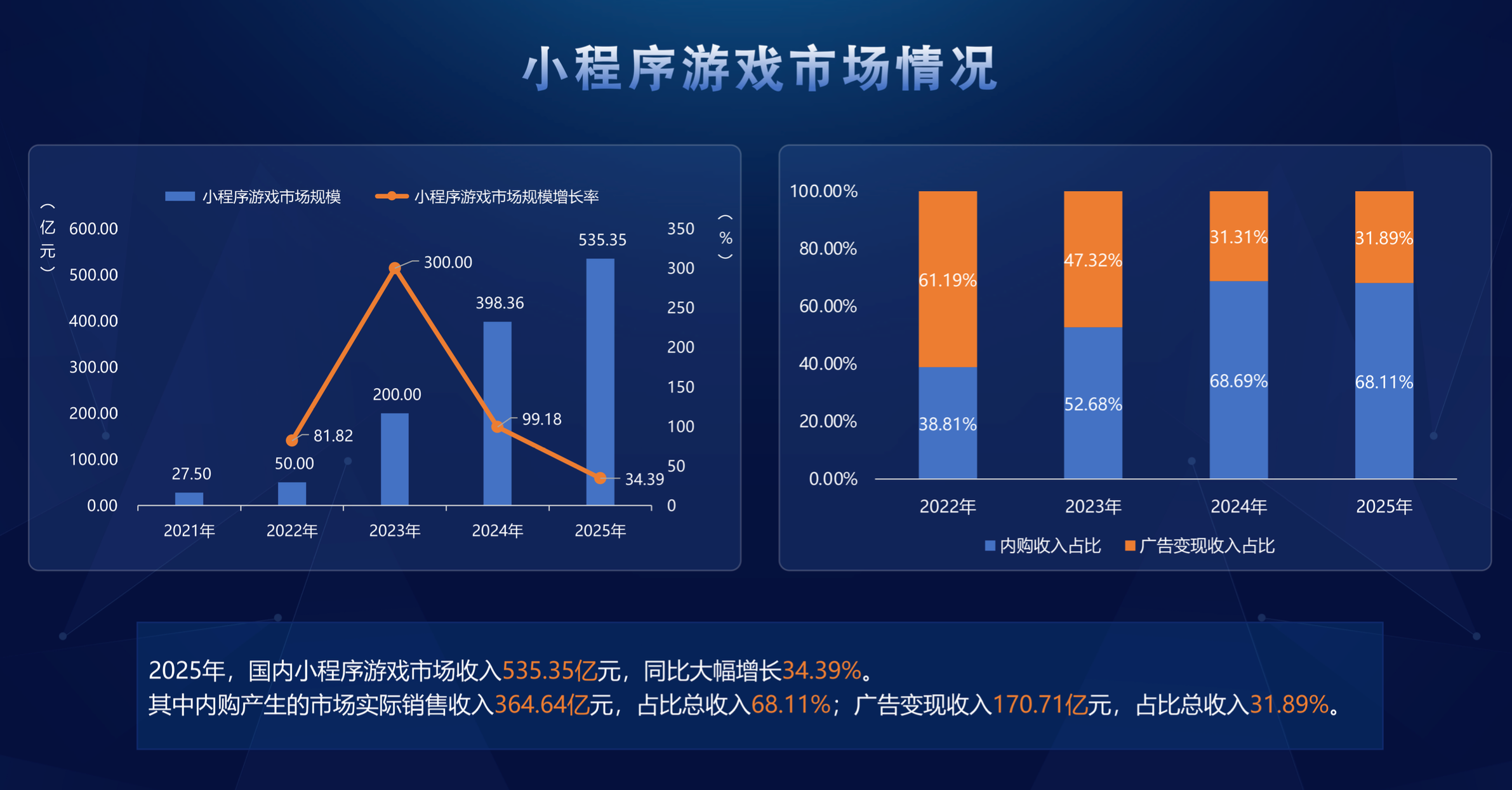 国内小程序游戏市场收入535.35亿元,同比大幅增长34.39%。其中内购产生的市场实销收入364.64亿元,占比总收入68.11%;广告变现收入170.71亿元,占比总收入31.89%。