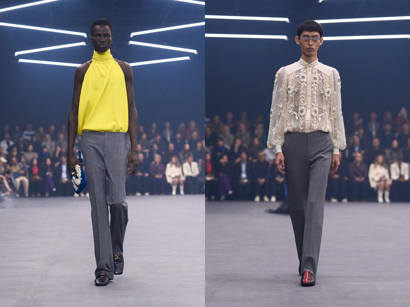事实上,近几年男装领域所谓的“创新”,往往直接等同于彻底的女性化。这种性别模糊的美学探索本身并无问题,但其受众主要集中在高度细分的先锋时尚圈层,对更主流的男性消费群体而言,吸引力始终有限。正如纽约时报记者Jacob Gallagher在评论Valentino 2026春夏系列时指出:“我不确定有多少零售商会愿意将男装预算投放在无袖的亮黄色挂脖上衣、透视衬衫或孔雀蓝荷叶边上衣上。性别在高级时装中或许是流动的,但商业现实依然存在。”