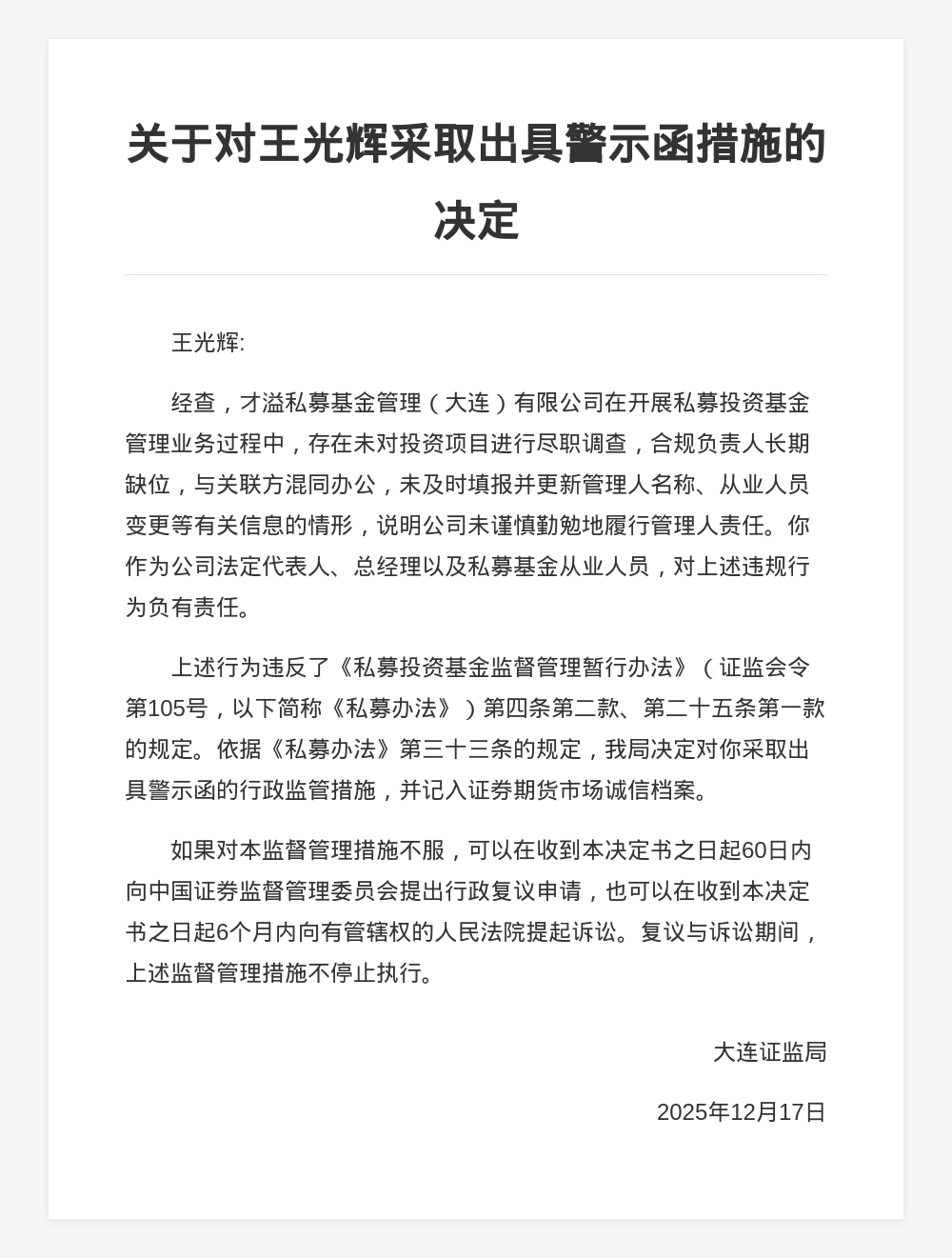 针对以上问题,大连证监局决定对才溢私募基金管理(大连)有限公司采取责令改正的行政监管措施,并记入证券期货市场诚信档案;对王光辉采取出具警示函的行政监管措施,并记入证券期货市场诚信档案。