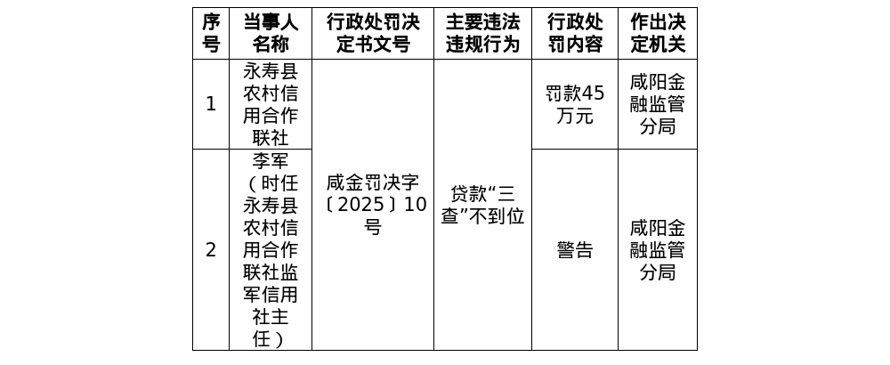 永寿县农信联社被罚45万,涉贷款“三查”不到位