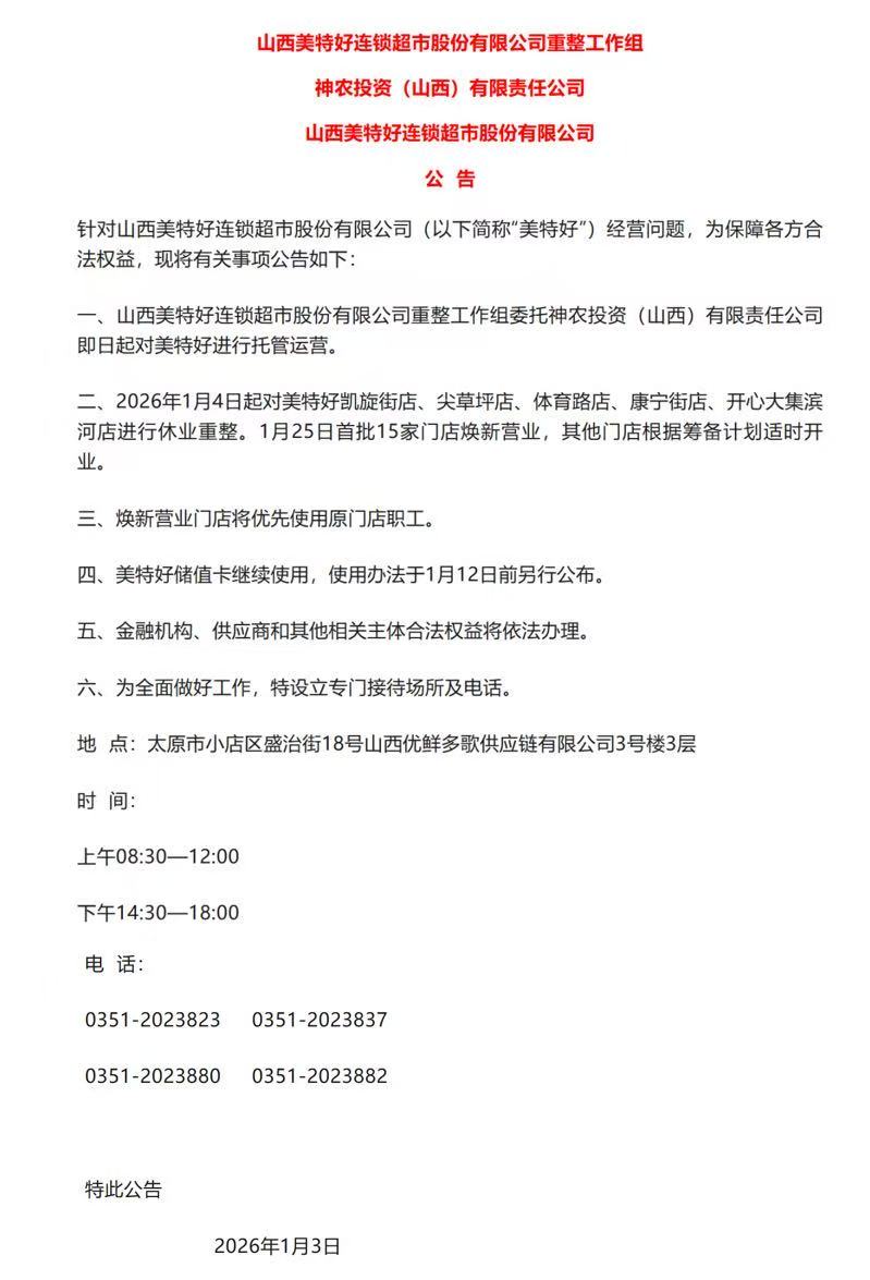 美特好公告显示,公司将由神农投资(山西)有限责任公司(以下简称:神农投资)全面托管运营。门店层面,1月4日起对美特好凯旋街店、尖草坪店、体育路店、康宁街店、开心大集滨河店进行休业重整。1月25日首批15家门店焕新营业,其他门店根据筹备计划适时开业。