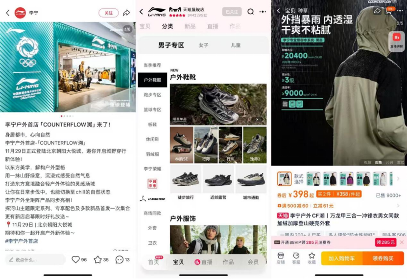 实际上,早在2005年李宁公司就获得法国户外品牌艾高在中国市场的运营权。随后几年里,李宁也曾在主品牌体系内试水户外主题、开出李宁探索直营店,但当时市场环境并不成熟。直到2024年,李宁首次将“李宁户外”作为单独系列发布。2025年以来,李宁加码户外趋势显著。当年11月,其COUNTERFLOW溯线下店在大庆和北京相继开业。