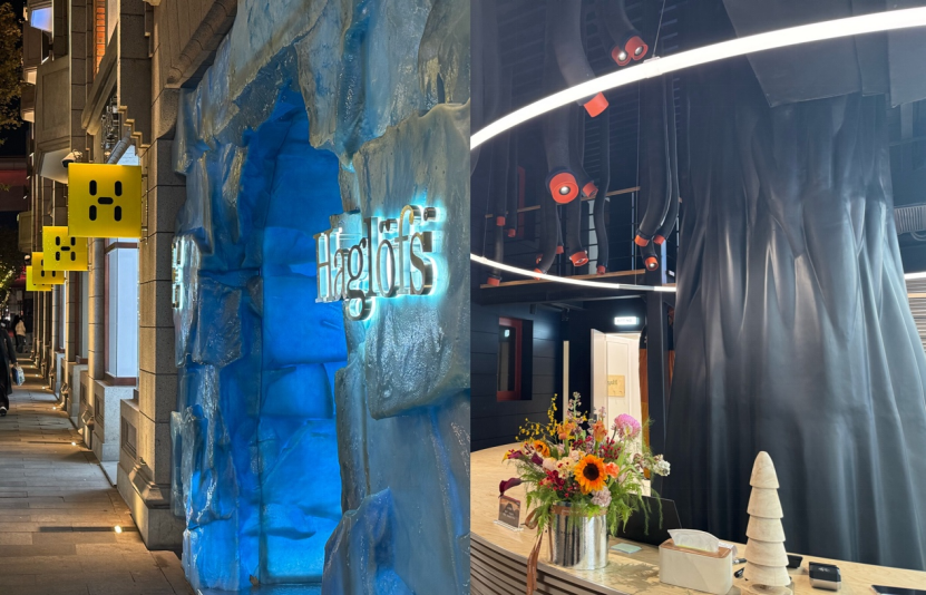 新店旁边有一个硕大的蓝冰洞置景,店内则充斥各类森林、雪山元素,“北欧感”扑面而来。店中心有一颗黑色粗壮的景观树干,店员透露这里边是一一棵真实存活、破楼而出的大树,出于保护自然的原则被包裹起来装饰成了北欧当地的景观。新店还专门设置了一层ESG服务空间,用于设置装备维修、旧物改造、环保沙龙等互动场景。