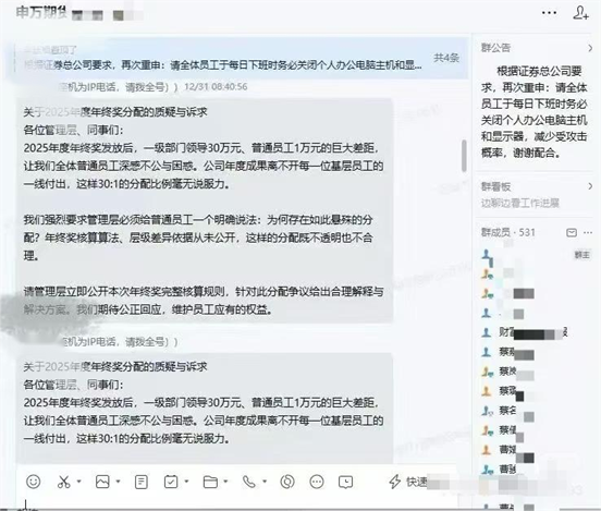 一名员工在有500多人的工作群“申万期货移动工作站”内发言,针对2025年度年终奖分配提出质疑和诉求:“2025年度年终奖发放后,一级部门领导30万元、普通员工1万元的巨大差距,让我们全体普通员工深感不公与困惑。”该员工提出,要求“管理层必须给普通员工一个明确说法。请管理层立即公开本次年终奖完整核算规则,针对此分配争议给出合理解释与解决方案。”