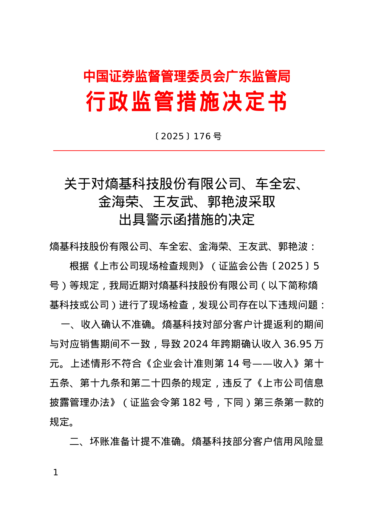 针对以上问题,广东证监局决定对熵基科技股份有限公司、车全宏、金海荣、王友武、郭艳波采取出具警示函的行政监管措施。