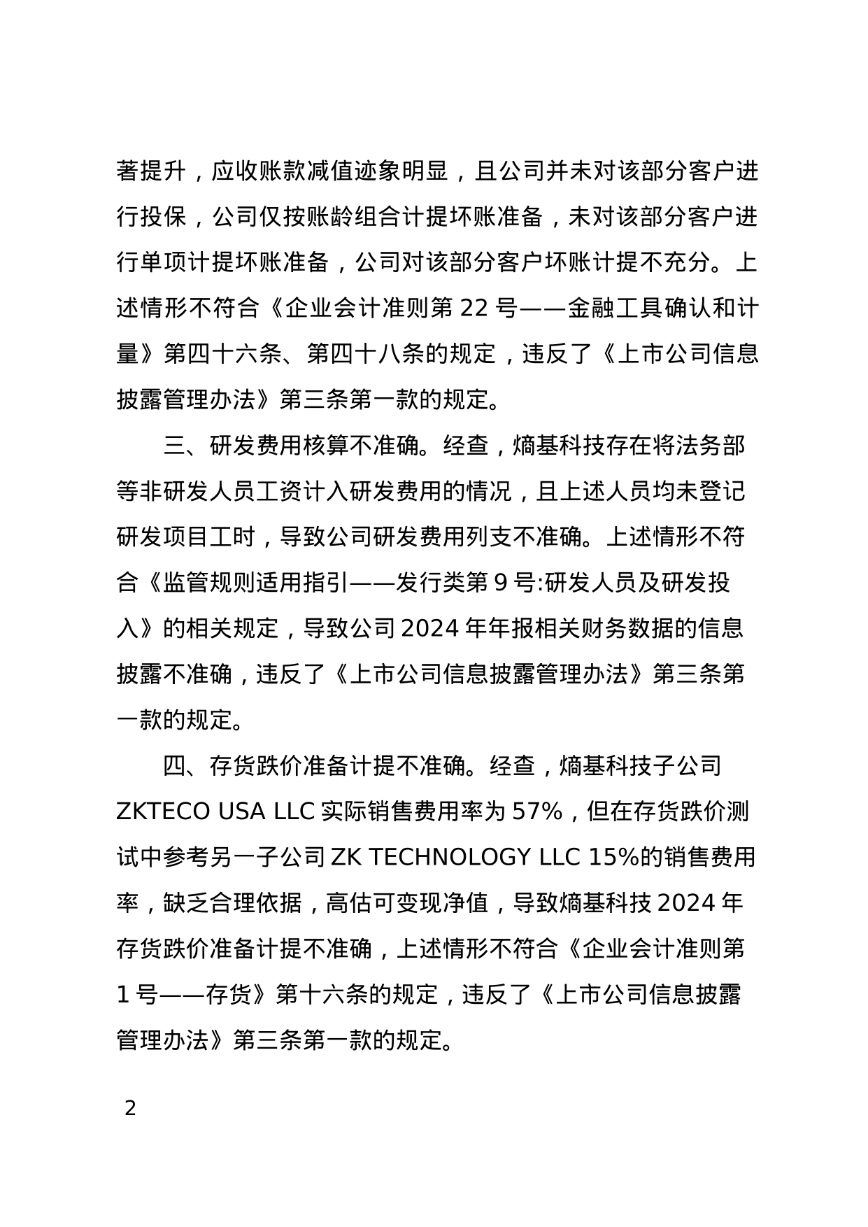 根据广东证监局的调查,熵基科技存在五项违规行为。首先,公司对部分客户的返利计提期间与销售期间不一致,导致2024年跨期确认收入36.95万元。其次,公司对部分信用风险显著提升的客户应收账款减值迹象明显,但未进行单项计提坏账准备,导致坏账计提不充分。此外,公司将非研发人员工资计入研发费用,且相关人员未登记研发项目工时,导致研发费用列支不准确。熵基科技在存货跌价测试中参考另一子公司的销售费用率,缺乏合理依据,导致存货跌价准备计提不准确。最后,公司在《2024年年度报告》中披露的与关联方ZKTECO SOLUTIONS INC.的关联交易金额与实际销售金额不一致。熵基科技董事长车全宏、总经理金海荣、财务总监王友武、董事会秘书郭艳波未履行勤勉尽责义务,对公司上述行为负有主要责任。其中,车全宏和金海荣对所有违规行为负责,王友武对前四项违规行为负责,郭艳波对第五项违规行为负责。广东证监局根据《上市公司信息披露管理办法》第五十二条的规定,决定对熵基科技及上述责任人采取出具警示函的行政监管措施。公司及相关责任人需在收到决定书30日内提交书面报告,并抄报深圳证券交易所。如对监管措施有异议,相关方可在收到决定书之日起60日内向中国证监会提出行政复议申请,或在6个月内向有管辖权的人民法院提起诉讼。复议与诉讼期间,监管措施不停止执行。