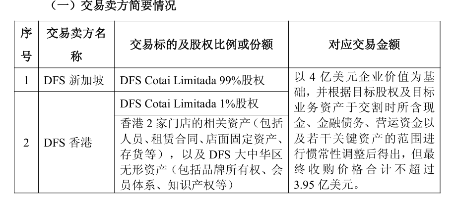 根据公告内容,此次收购标的为DFS新加坡、DFS香港持有的DFS Cotai Limitada100%股权及DFS香港持有的2家门店的相关资产以及DFS大中华区无形资产。公开资料显示,DFS是全球领先的高端旅游零售商,成立于1960年,其门店遍布全球主要机场及市中心核心地段,目前为奢侈品集团LVMH所持有。