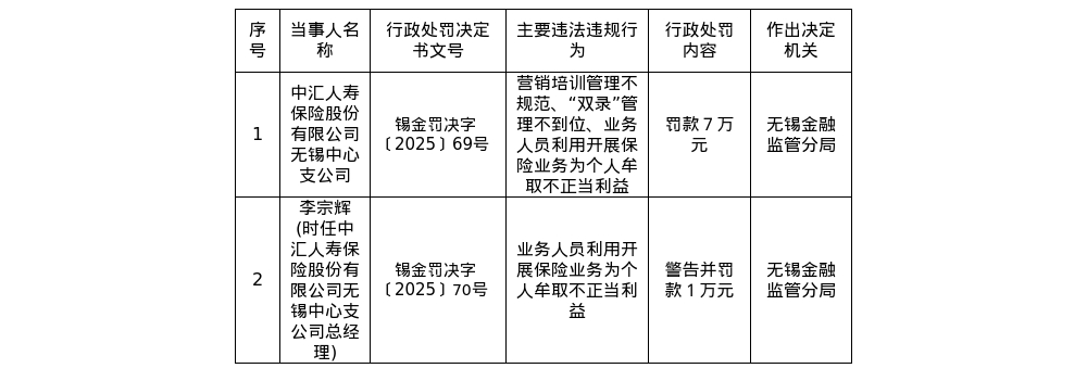 罚单显示,中汇人寿保险股份有限公司无锡中心支公司的主要违法违规事实(案由)为:营销培训管理不规范、“双录”管理不到位、业务人员利用开展保险业务为个人牟取不正当利益。
