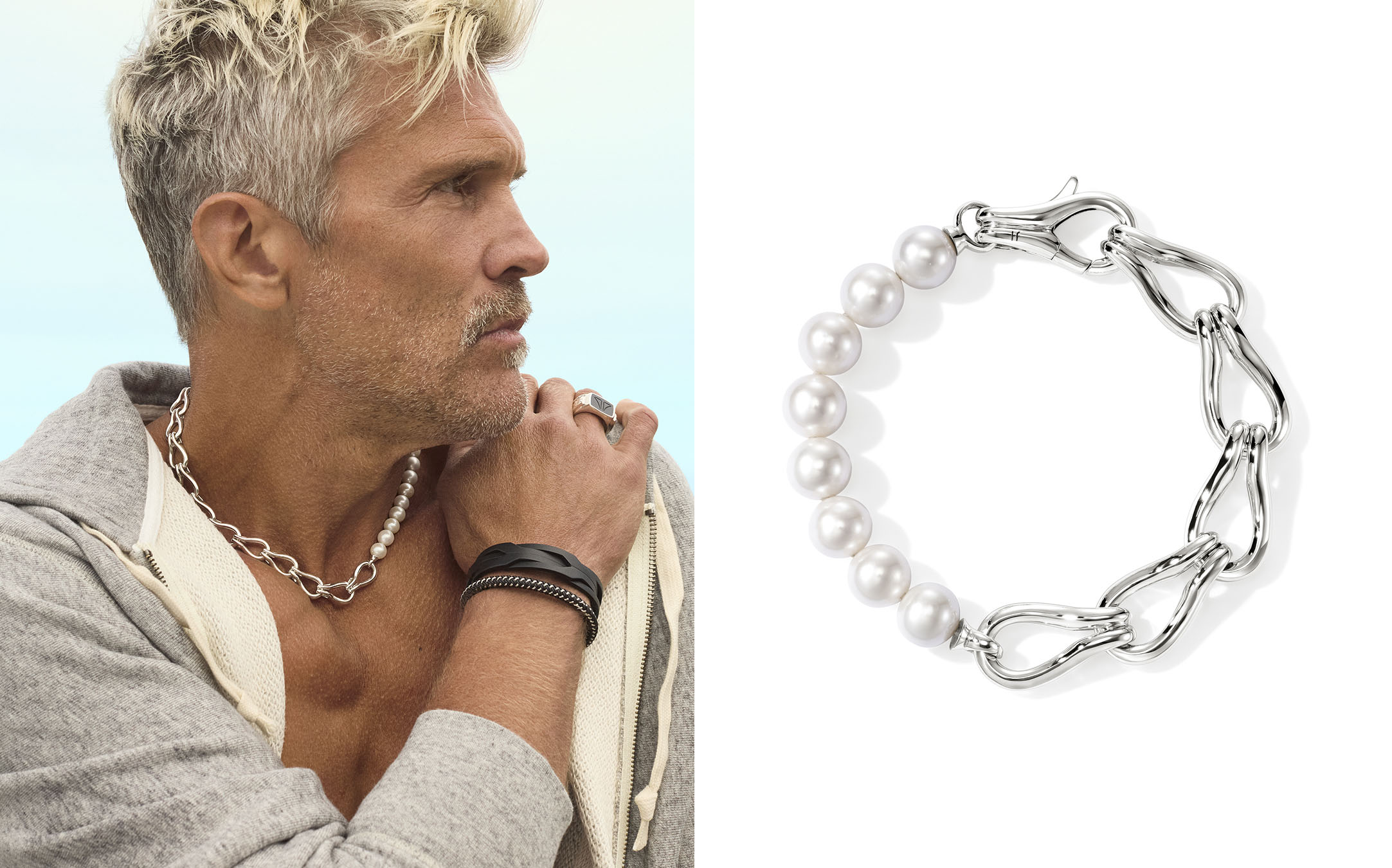 相比传统的白色珍珠,更多男士选择带有虹彩、深色调的珍珠,并与工业风元素叠加,如粗链条、做旧金属,形成刚柔并济的独特语言。珍珠正成为男士饰品体系中最具文化反差感、同时又最能吸引注意力的材质之一。