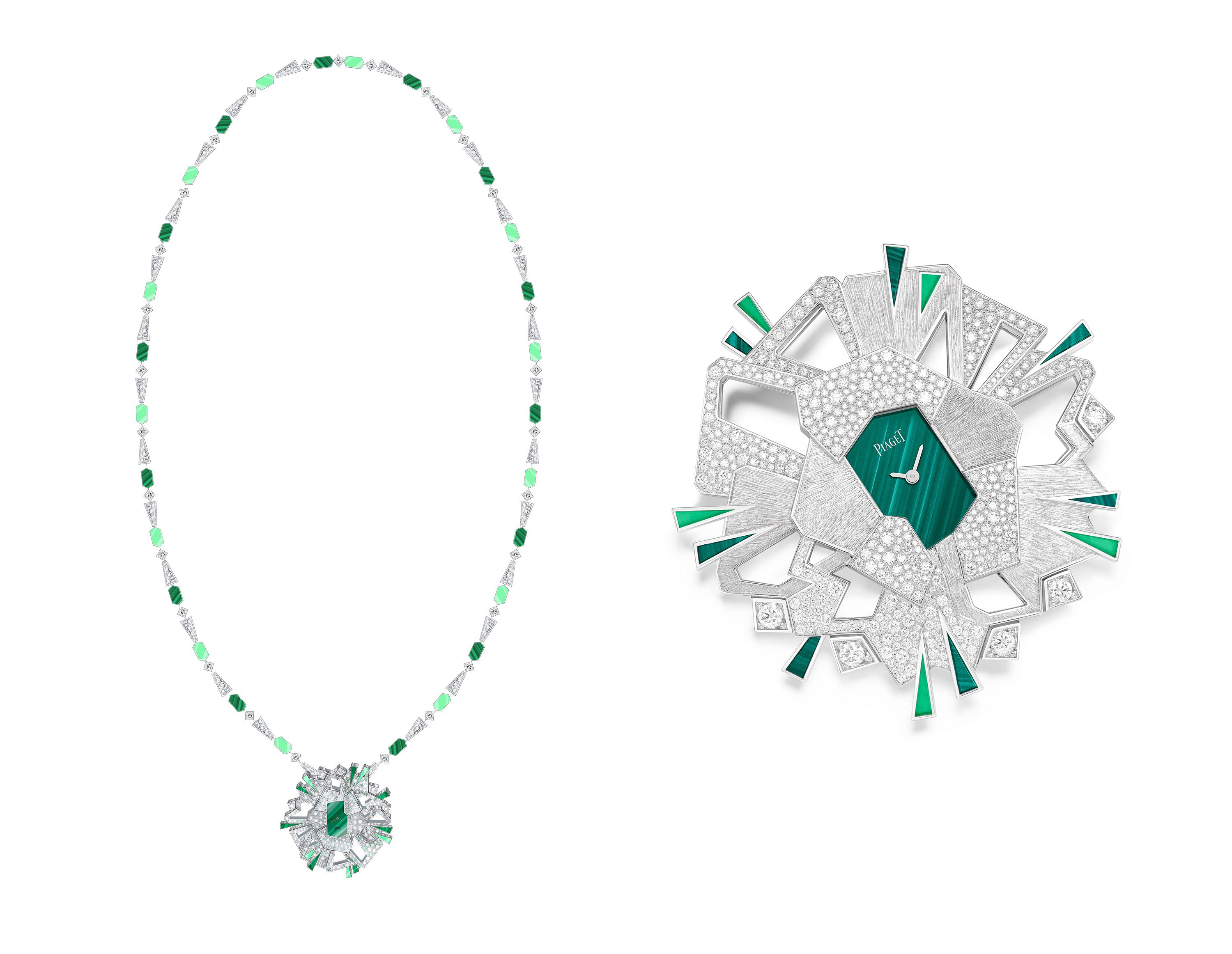 其中Arty Pop流行艺术主题坠饰时计采用18K白金打造,搭配孔雀石与绿玉髓嵌饰,表盘采用孔雀石材质,辅以钻石点缀。该表款搭载伯爵355P石英机芯,具备可转换式设计,坠饰表盘可拆卸为腕表佩戴,长链部分亦可作为项链独立使用。多功能构造与几何外观,使其适用于正式或日常造型中的多样搭配场景。