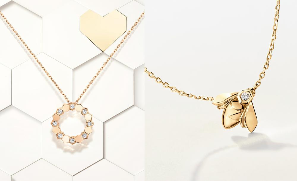 Bee de Chaumet系列采用抛光黄金勾勒出几何蜂巢结构与抽象蜜蜂形象,搭配明亮式切割钻石,构建出层次分明、光影互动的造型语言。新作项链以100%可追溯黄金制作,确保从矿源到成品的全链路监管,体现品牌在原材料采购上的可持续实践。蜜蜂意象不仅承载了Chaumet延续两个多世纪的自然主义审美传统,也回应了当代珠宝设计中对生态责任与工艺透明度的关注。