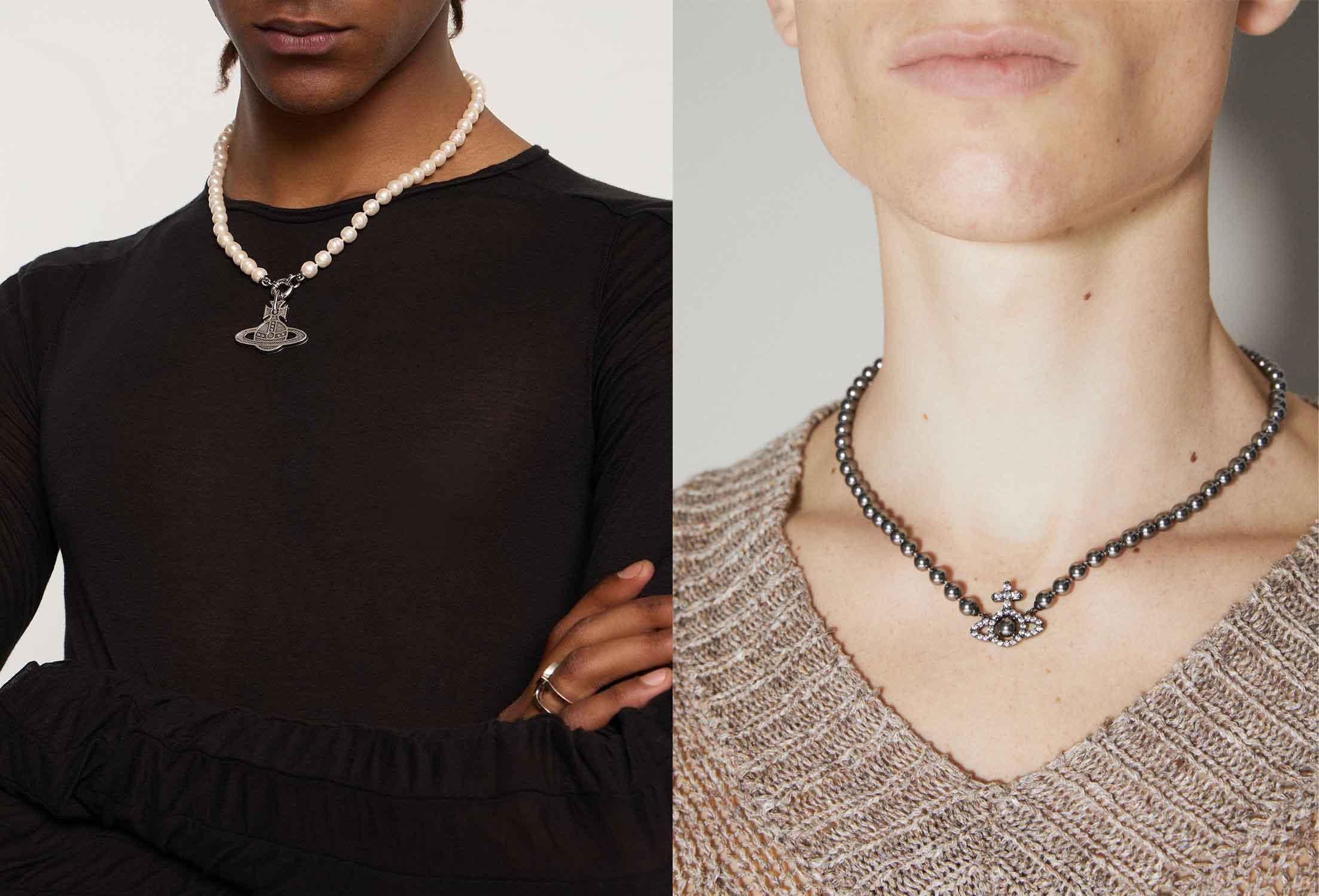 Vivienne Westwood的珍珠系列并未沿循传统珠宝的柔化表达,而是将珍珠纳入品牌一贯的朋克语境。通过多排结构、短颈比例与放大的造型处理,并结合标志性吊坠元素,将英式贵族符号与叛逆精神并置,形成具有张力的视觉表达。该系列常用于打破造型的对称与平衡,适配正装或简约服饰,强化整体风格表达。对男性佩戴者而言,珍珠在此脱离柔性定位,转化为展现态度与立场的造型工具。