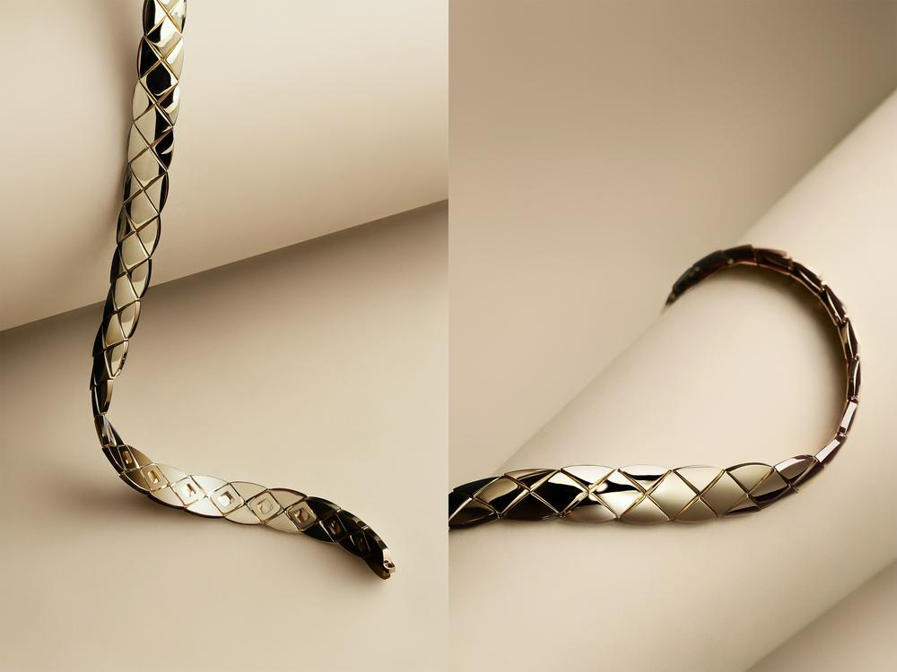 两款全新项链作品分别为柔性短项链与贴颈项链,设计贴合颈部线条,整体构造由菱格纹网状结构连接,并配有可滑动搭扣以增强贴合度。柔性短项链提供米色K金、黄金与白金三种材质版本,部分镶嵌钻石,强调结构与比例。贴颈项链则聚焦于K金本身的光泽与结构表达,更具现代前卫风格,呈现出鲜明的当代中性气质。