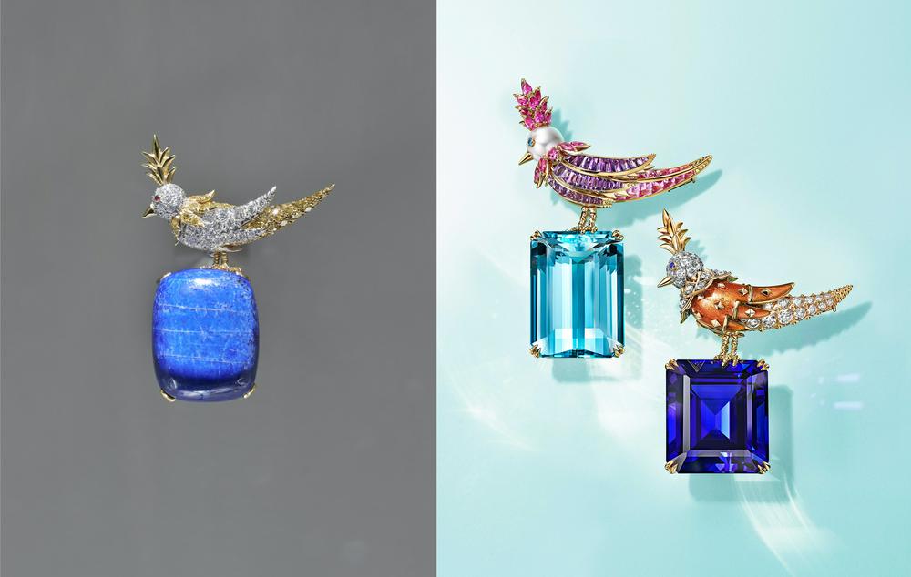 “石上鸟”胸针诞生于1965年,是品牌高级珠宝中最具识别度的设计之一。作品以彩色宝石为主体结构,小鸟立于其上,形成明确的上下构图。早期版本常采用蛋面切割宝石作为基座,如青金石、绿碧玺或摩根石,小鸟则以钻石或彩钻铺镶,通过宝石色彩与切割方式的对比,强化整体层次。