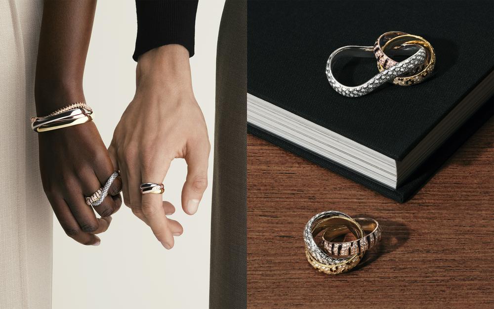 Trinity系列以黄K金、白K金与玫瑰金三环交织为核心结构,新作在延续三环交织结构的基础上,引入品牌标志性的动物纹样作为设计亮点。三枚环圈分别对应不同图纹:白K金环圈以蛇鳞纹理呈现起伏肌理;黄K金与玫瑰金环圈则以黑漆描绘豹纹与虎纹,并通过圆润或更立体的起伏处理强化触感与层次。系列同时推出双指戒与单只耳环,三色金与图纹的组合也削弱了单一风格指向,更适合以中性思路进行搭配。