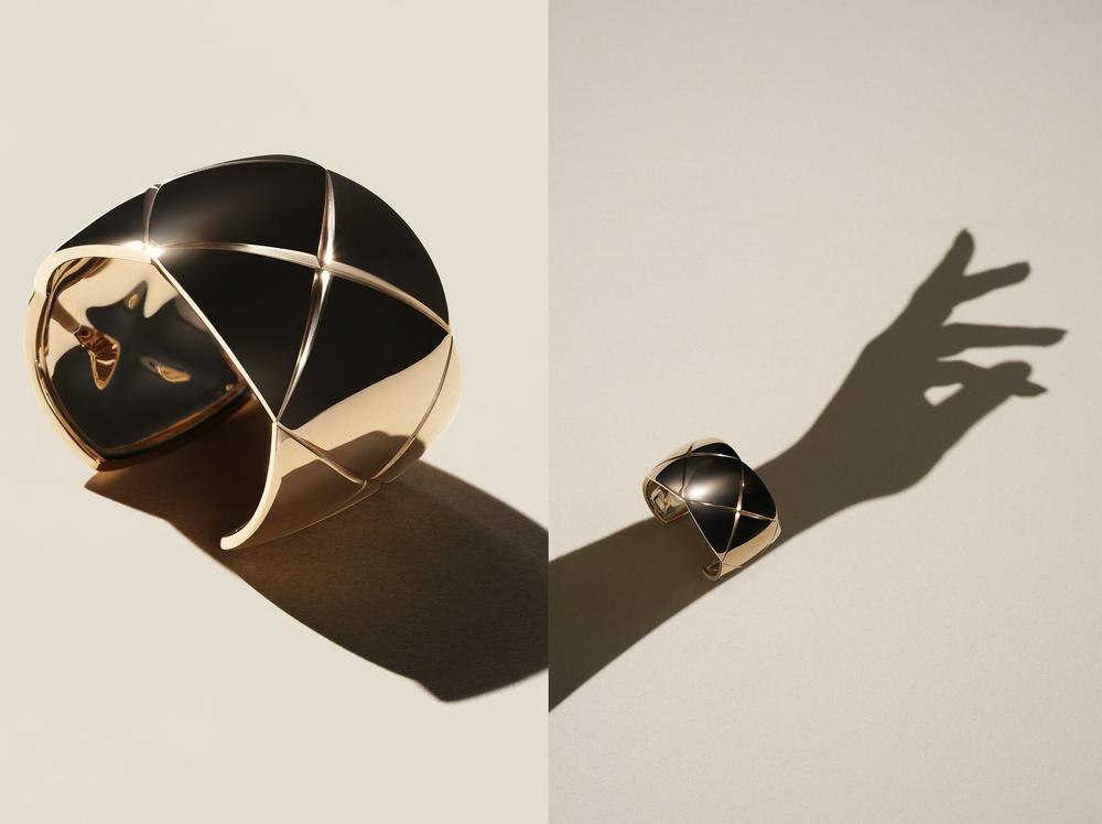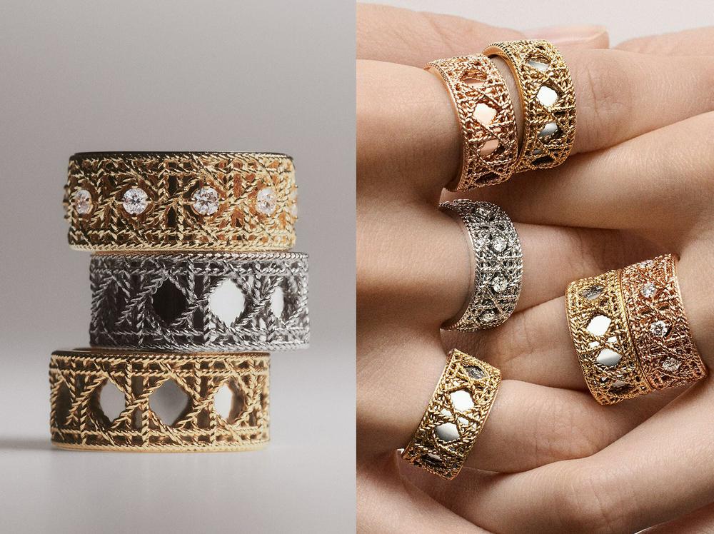 由维多利娅·德卡斯特兰设计的My Dior系列,以金属编织工艺重构品牌经典藤格纹图案。作品通过18K白金与18K黄金的交织,模拟细密网格结构,呈现出如织物般的柔性质感。藤格纹的线条由黄金构成,白金底板则提供冷调光泽,两者在色彩与光感上形成对比。该系列珠宝采用高抛光与精细打磨处理,强化金属的纹理表现。整体风格以简洁构型为主,在细节中延续Dior一贯的工艺传统与建筑感美学。