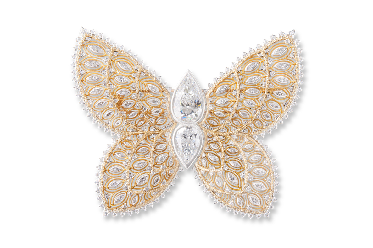 “Buccellati布契拉提威尼斯蝴蝶”胸针为威尼斯展览特别设计,主体由两颗水滴形钻石构成,辅以50颗总重1.92克拉的榄尖形切割钻石与270颗总重1.54克拉的明亮式切割钻石,构建双翼结构。边缘采用18K白金蕾丝和钻石构成,搭配镂空纹理增强视觉层次,提升轻盈质感。