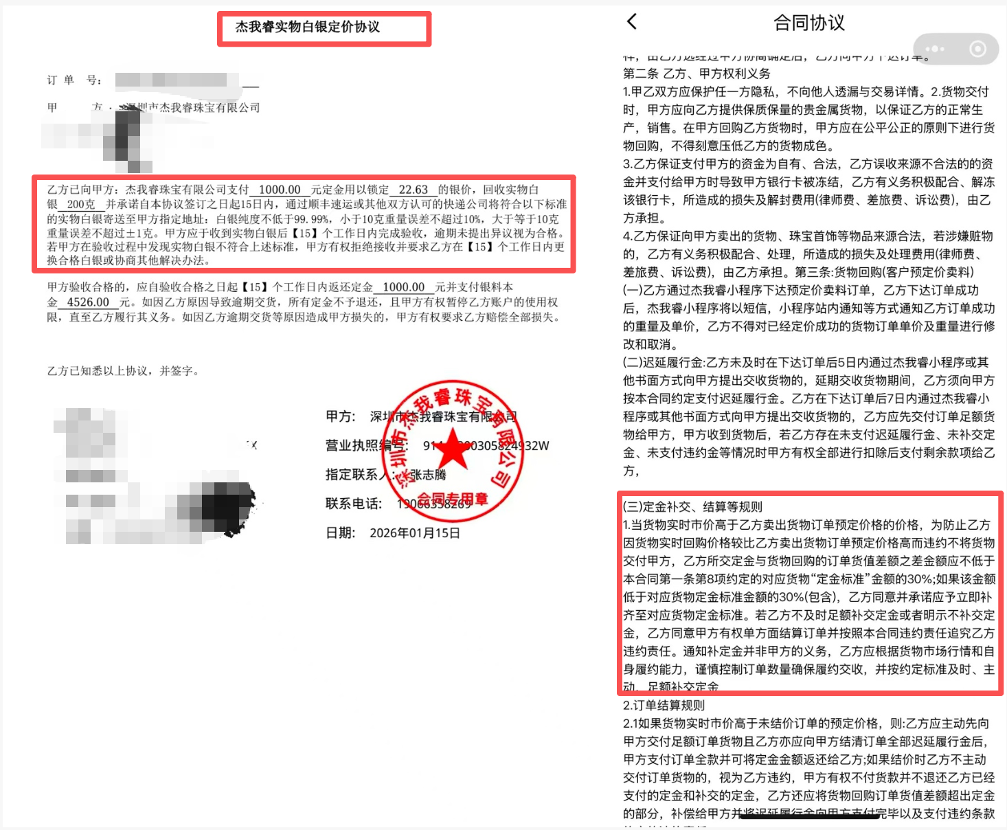 除常规的金银销售回收外,杰我睿还经营有黄金寄存、黄金/白银定价等业务。受访者小文告诉记者,2025年4月,她通过社交平台了解到杰我睿,初期只是尝试性投入2000元。随后又陆续邮寄了400余克黄金——将实物黄金寄给平台可获得相当于金价85%的返现。与此同时,小文还购买了部分“定价订单”,累计投入本金(含黄金价值)约达50万元。