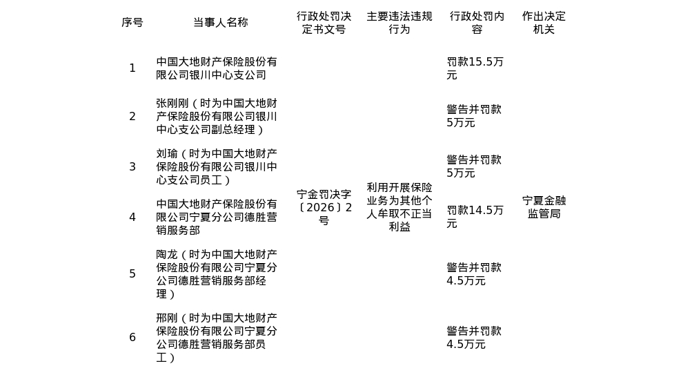 大地财险银川中支、宁夏分公司德胜营销服务部被罚30万,责任人共被罚19万