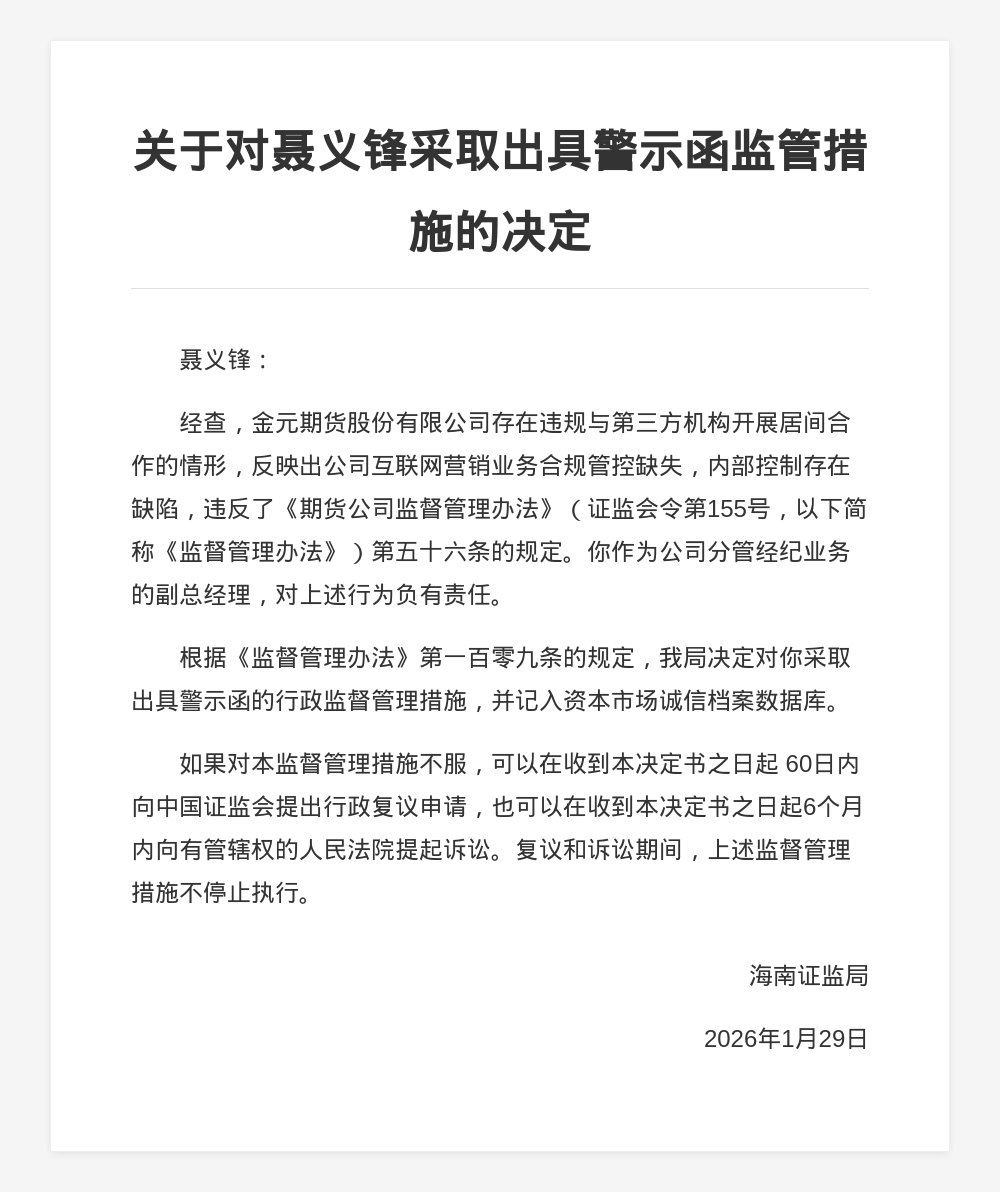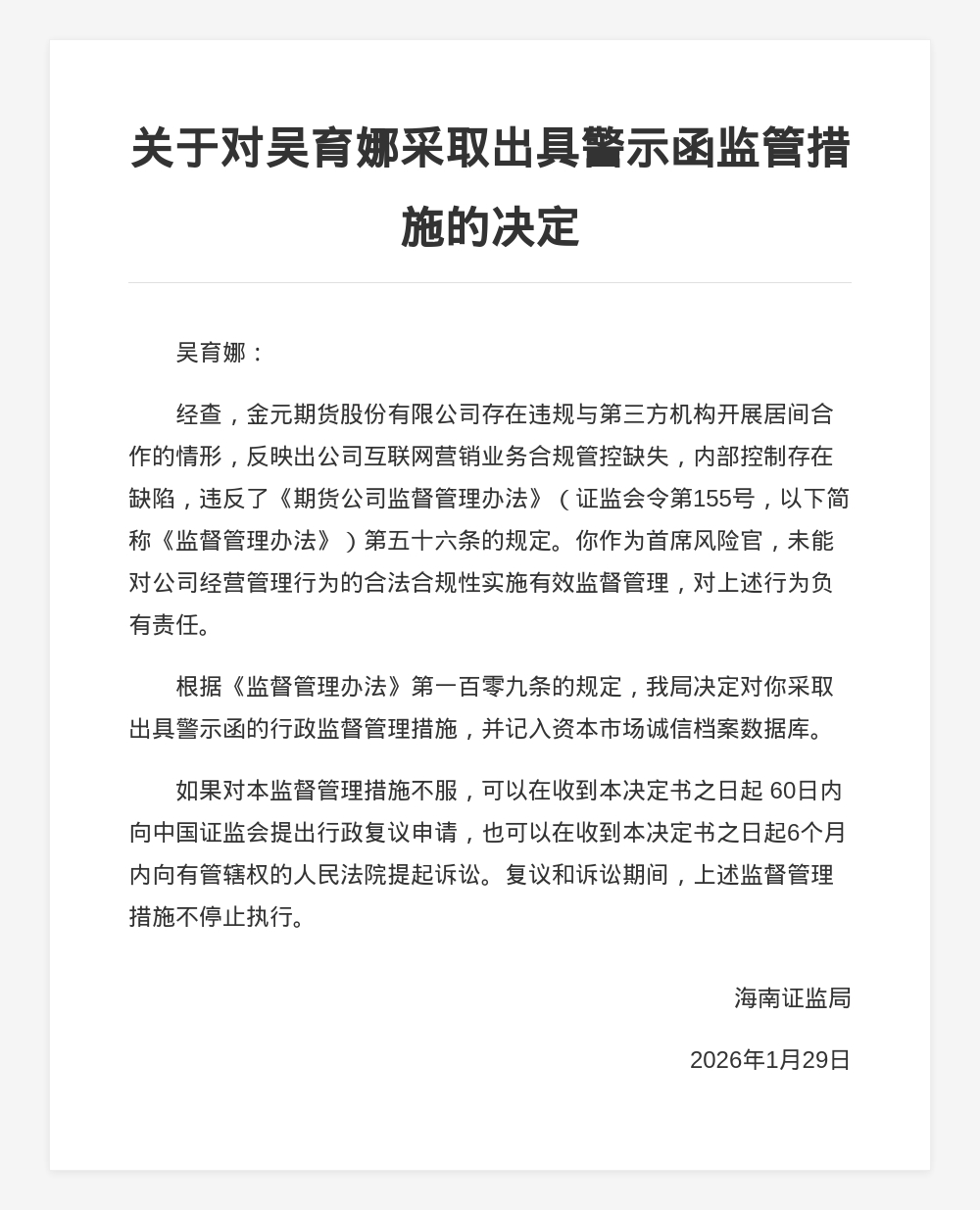对此,海南证监局决定对金元期货采取责令改正的行政监督管理措施,并记入资本市场诚信档案数据库;对聂义锋、吴育娜采取出具警示函的行政监督管理措施,并记入资本市场诚信档案数据库。
