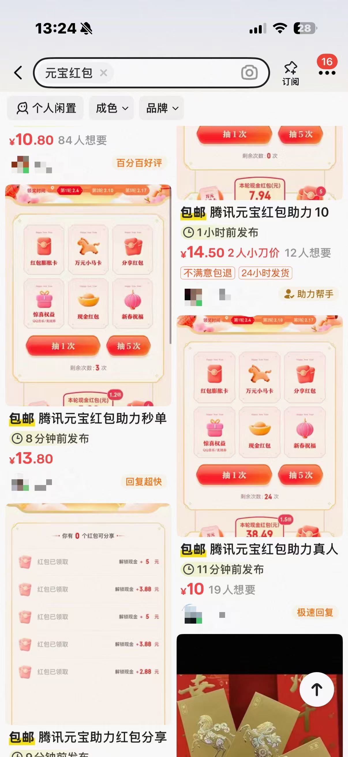 根据元宝红包的玩法,每个用户初始阶段仅拥有有限次数的抽红包资格,要想继续领取红包或参与抽万元小马卡等活动则需要参与分享红包活动,分享红包被10个用户领取才能增加抽红包次数。因此这种明显需要“凑人数”的裂变玩法催生出了“助力”生意。