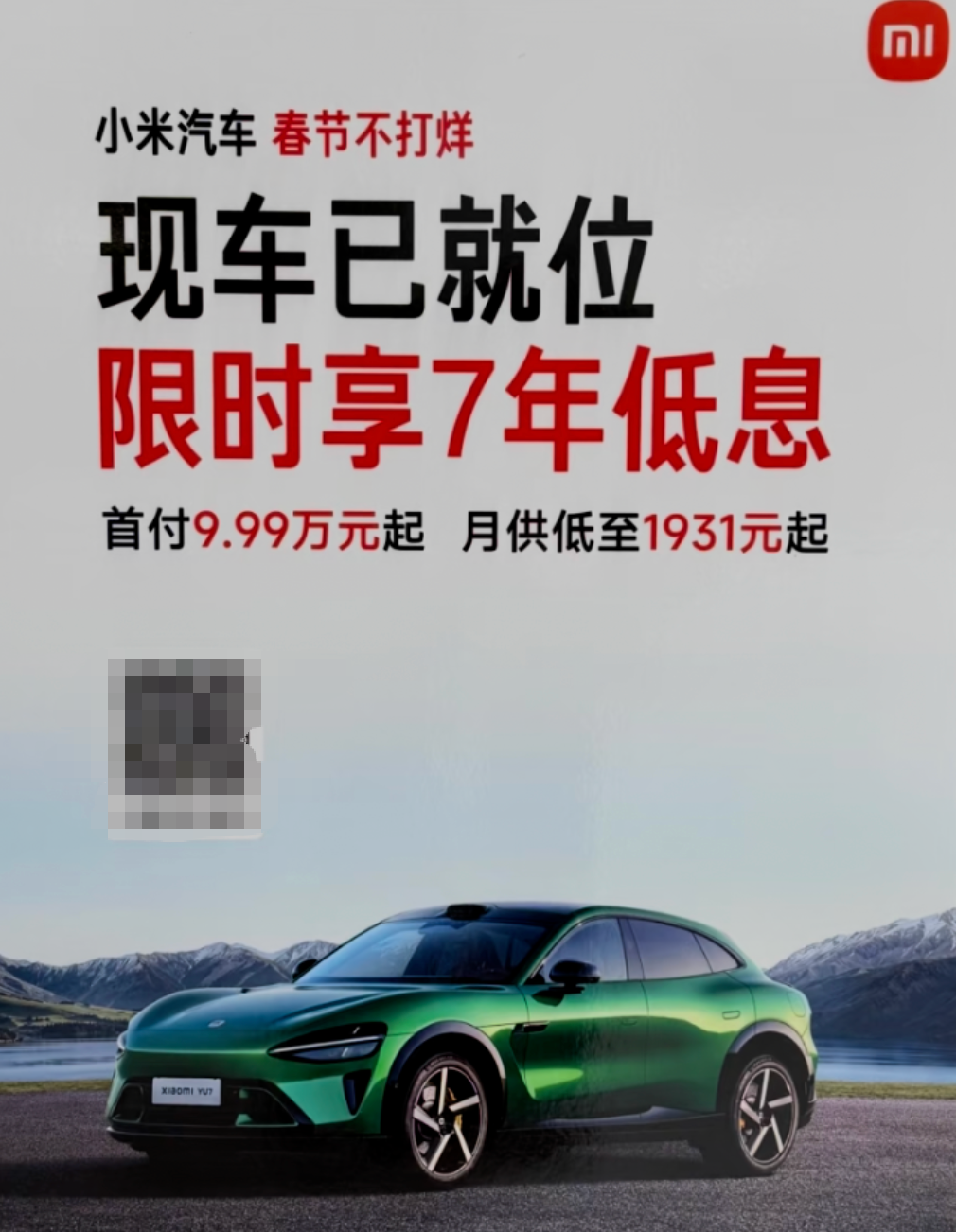 以上海一家门店为例,门店海报显示“小米汽车春节不打烊,现车已就位,限时享7年低息,首付9.99万起,月供低至1931元”。