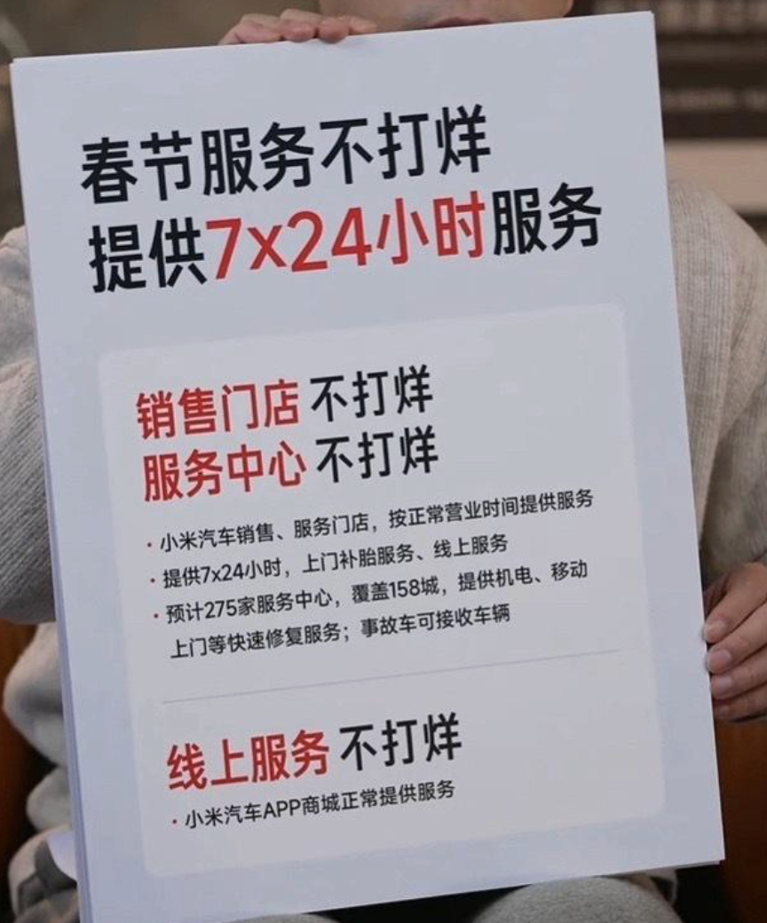 今年小米汽车推出不打烊服务,雷军在年前直播时表示,提供7x24小时服务,包括销售门店不打烊、服务中心不打烊、线上服务不打烊。