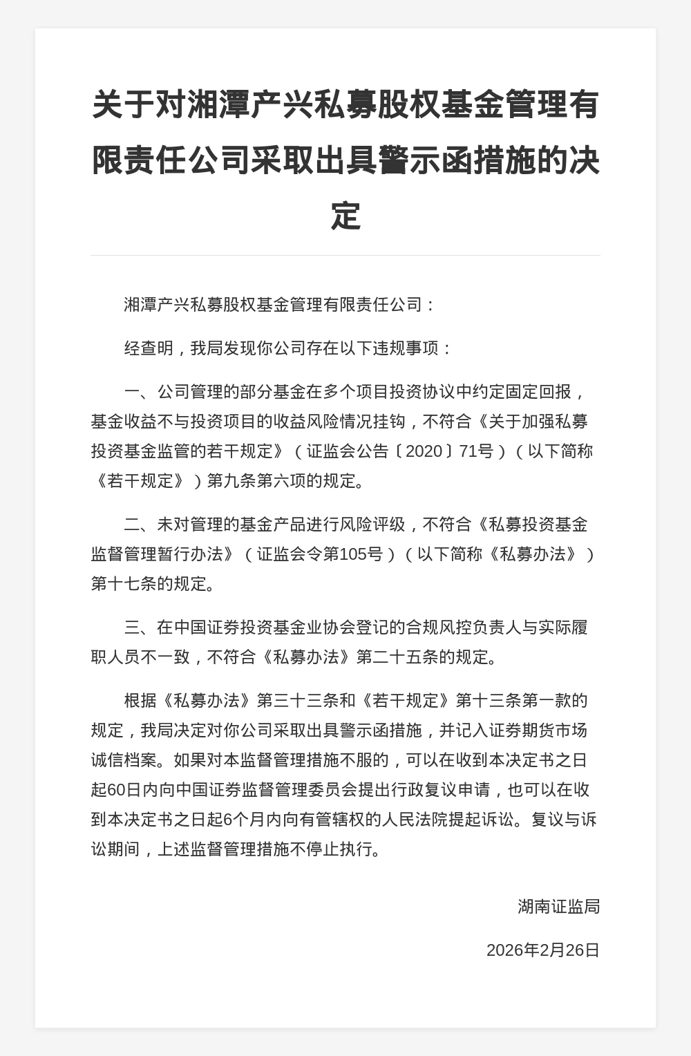 对此,湖南证监局决定对湘潭产兴私募股权基金管理有限责任公司采取出具警示函措施,并记入证券期货市场诚信档案。