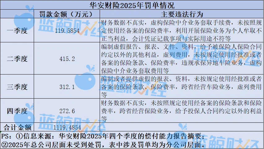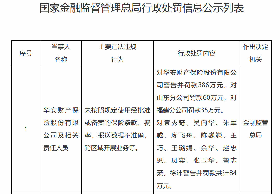 蓝鲸新闻2月28日讯(记者 陈晓娟)刚开年,华安财产保险股份有限公司(下称“华安财险”)就收到一张大额罚单。日前,金融监管总局对其开出565万元罚单,其中,总公司被罚386万元,山东分公司被罚60万元,福建分公司被罚35万元,相关责任人员合计被罚84万元。值得关注的是,相关责任人中的凤奕、徐沛、吴向华,不乏指向华安财险现任两名总经理助理及总精算师。