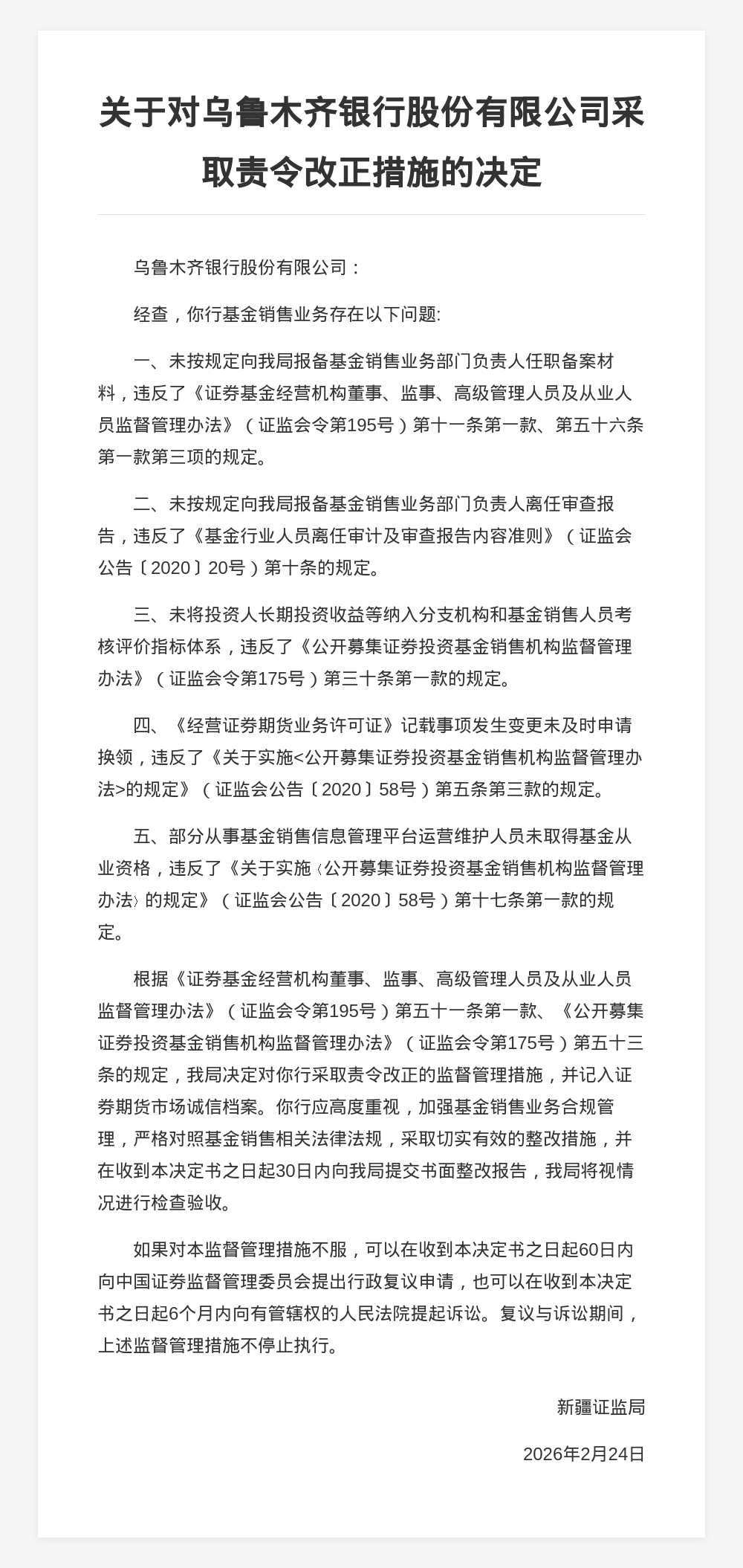 以上行为违反了《证券基金经营机构董事、监事、高级管理人员及从业人员监督管理办法》《基金行业人员离任审计及审查报告内容准则》《公开募集证券投资基金销售机构监督管理办法》《关于实施<公开募集证券投资基金销售机构监督管理办法>的规定》的相关规定。新疆证监局决定对乌鲁木齐银行采取责令改正的监督管理措施,并记入证券期货市场诚信档案。