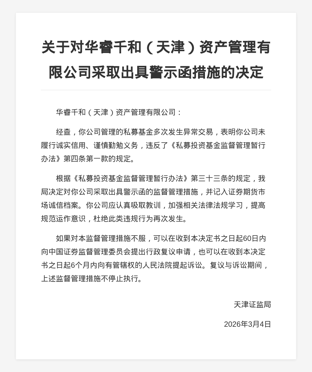 华睿千和(天津)资管被出具警示函,涉多次异常交易