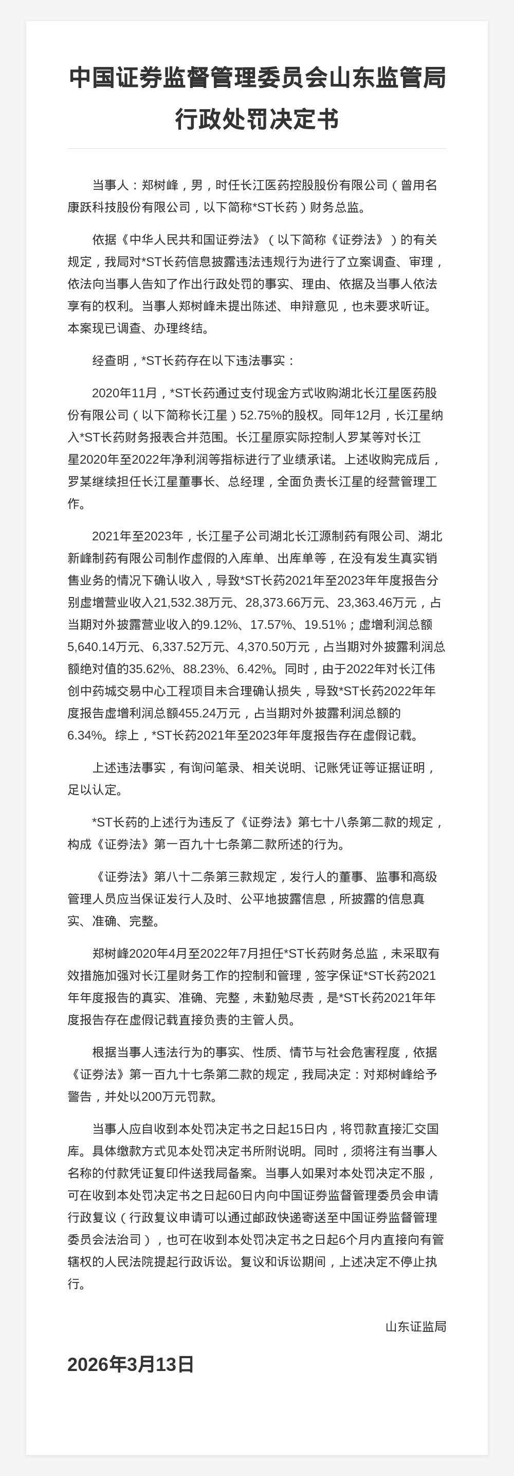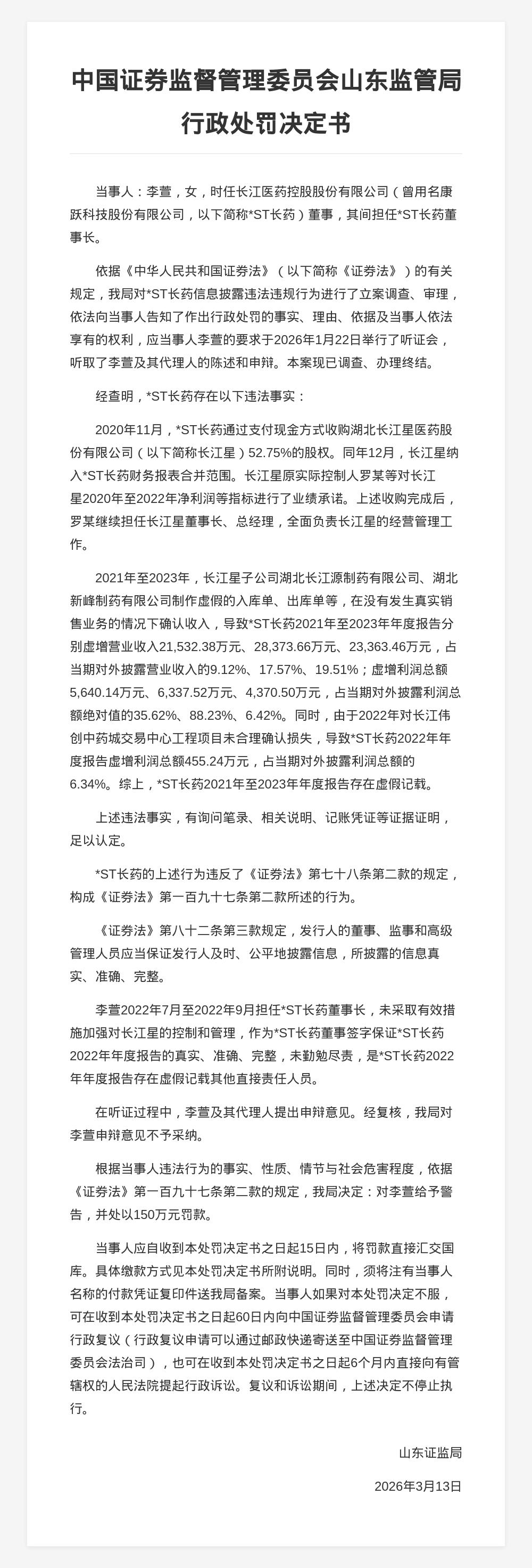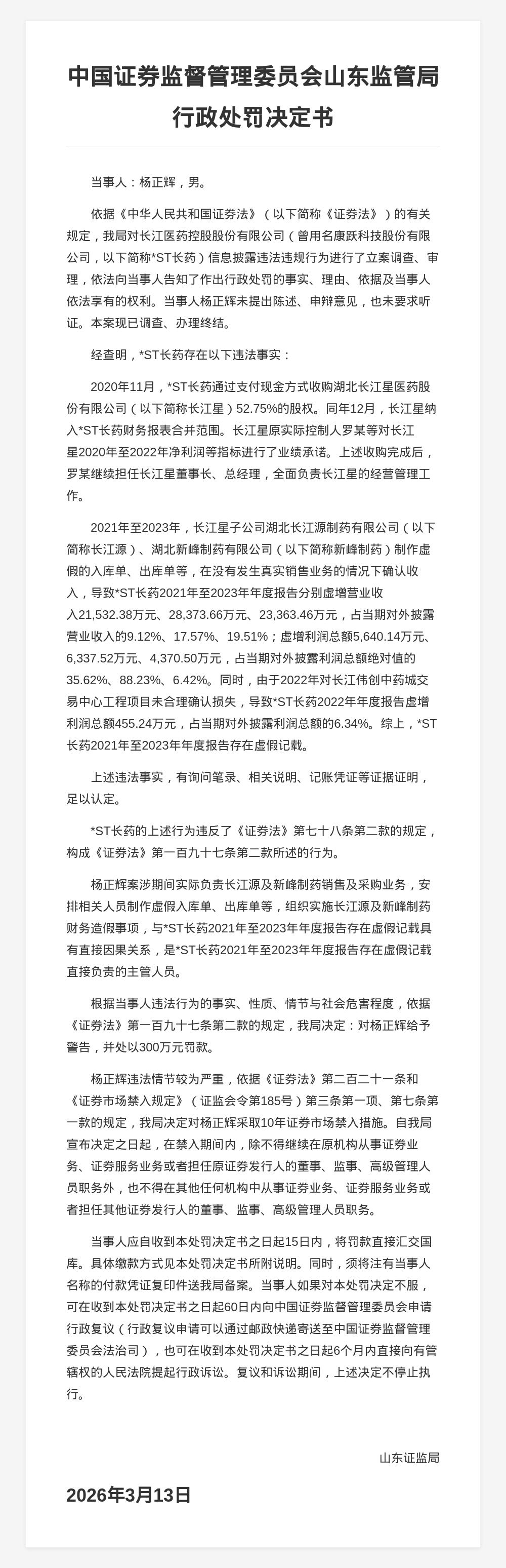蓝鲸新闻3月18日讯,近日,山东证监局发布行政监管措施决定书,对*ST长药(曾用名康跃科技股份有限公司)信息披露违法违规行为的相关责任人进行了处罚。