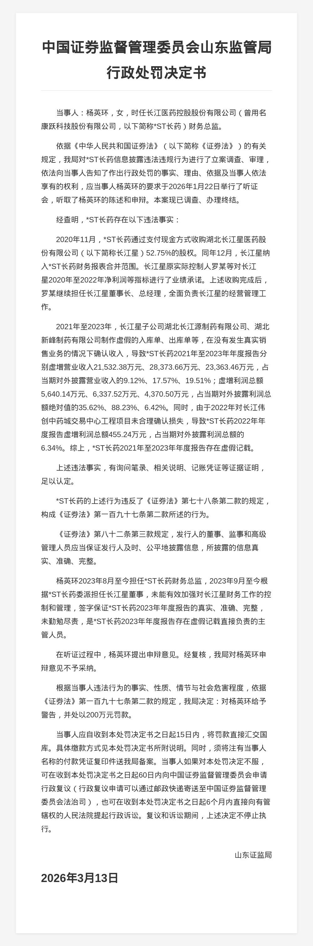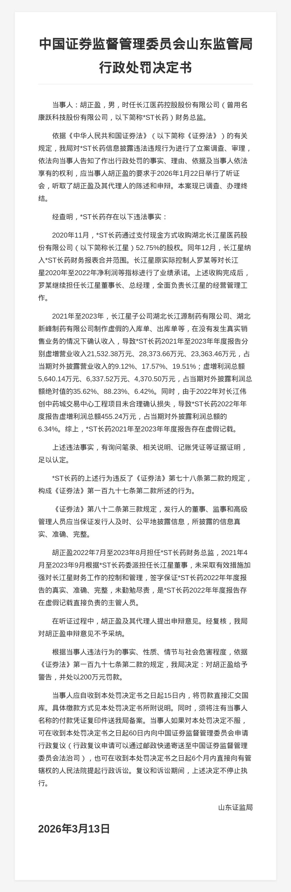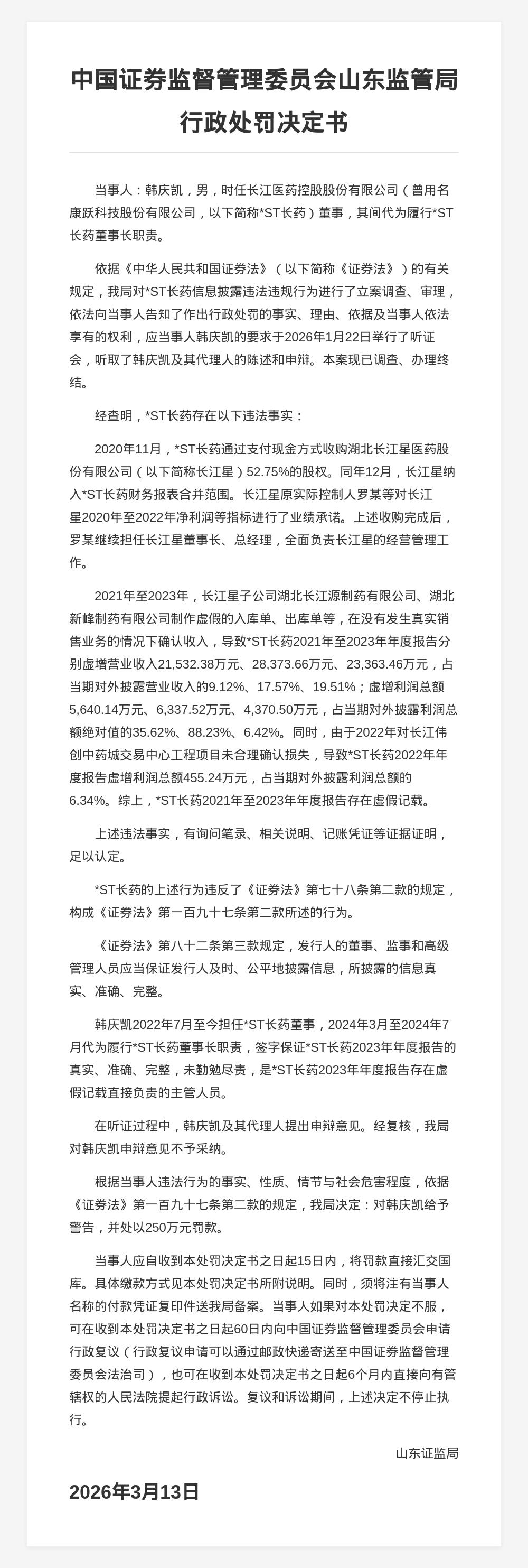 蓝鲸新闻3月18日讯,近日,山东证监局发布行政监管措施决定书,对*ST长药(曾用名康跃科技股份有限公司)信息披露违法违规行为的相关责任人进行了处罚。